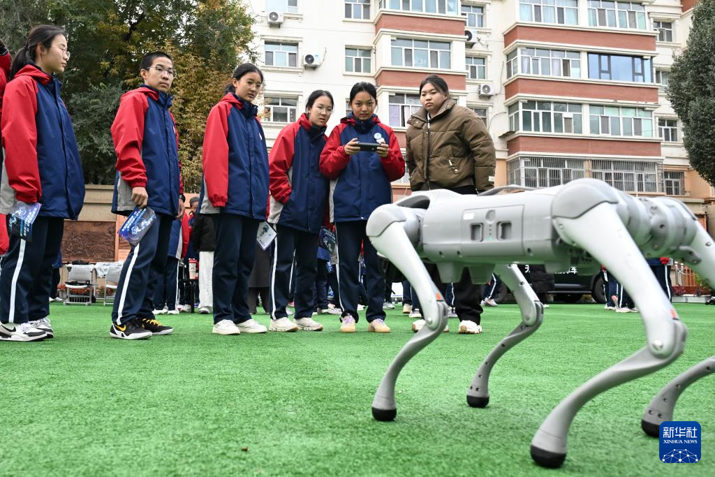 10月14日,新疆生产建设兵团第一中学学生观看智能机器狗进行复杂运动。