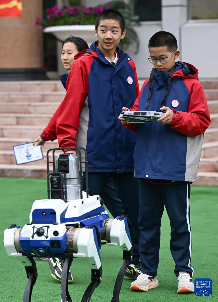 10月13日,新疆生产建设兵团第一中学学生在科技节开幕式上操控智能机器狗。