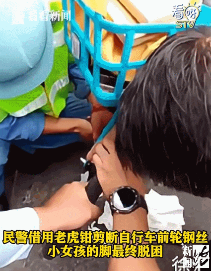 最终,民警借助老虎钳将自行车钢丝剪断后,女孩的脚才得以脱困。