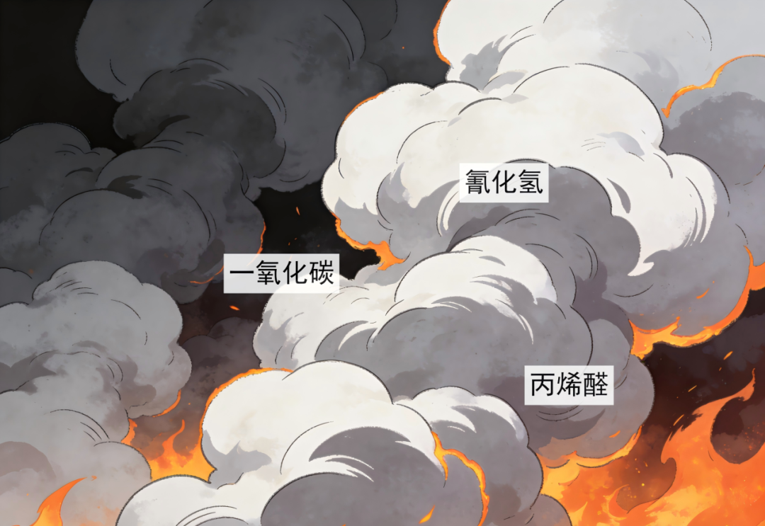 烟雾由高温气体、细小颗粒和有毒成分组成,其中最危险的包括: