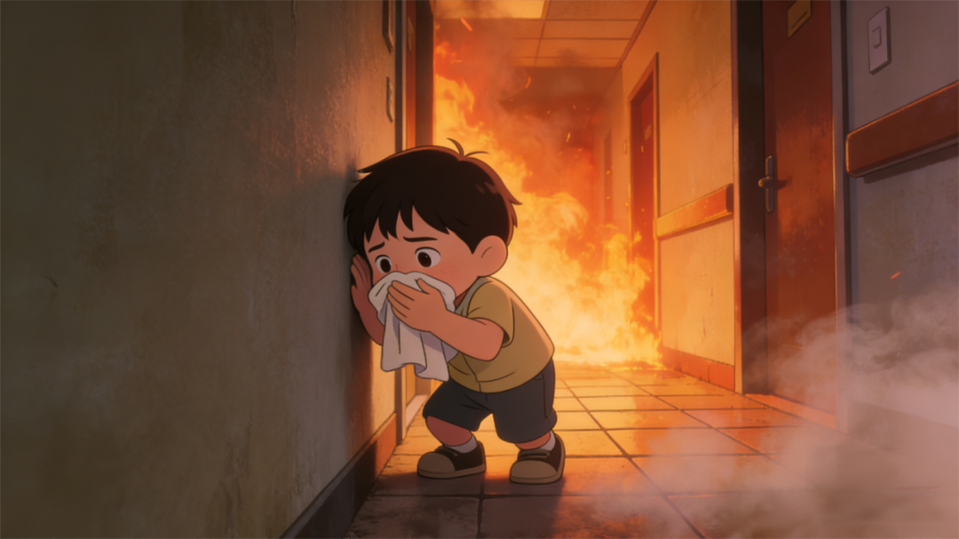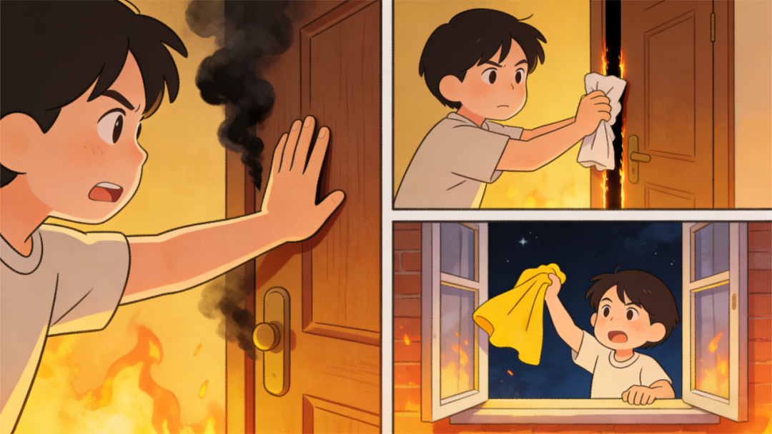 火灾中,如果要开门,一定先伸出手背轻贴门板——如果感觉烫手或发现门缝冒烟,立刻退回。然后,用湿毛巾塞紧门缝,到窗边挥动亮色衣物或闪手电求救。