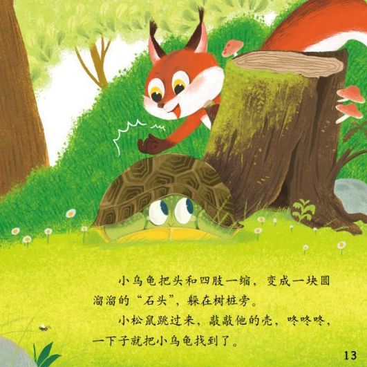 春天,小乌龟从洞里钻出来,伸了个懒腰,慢悠悠地爬进了树林。他看到小松鼠,开心地说:“我们一起玩捉迷藏吧。”小乌龟把头和四肢一缩,变成一块圆溜溜的“石头”,躲在树桩旁。