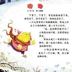 一只毛茸茸的小鸡蹦蹦跳跳,雪地上印出了小鸡的脚印,像一片片小竹叶。