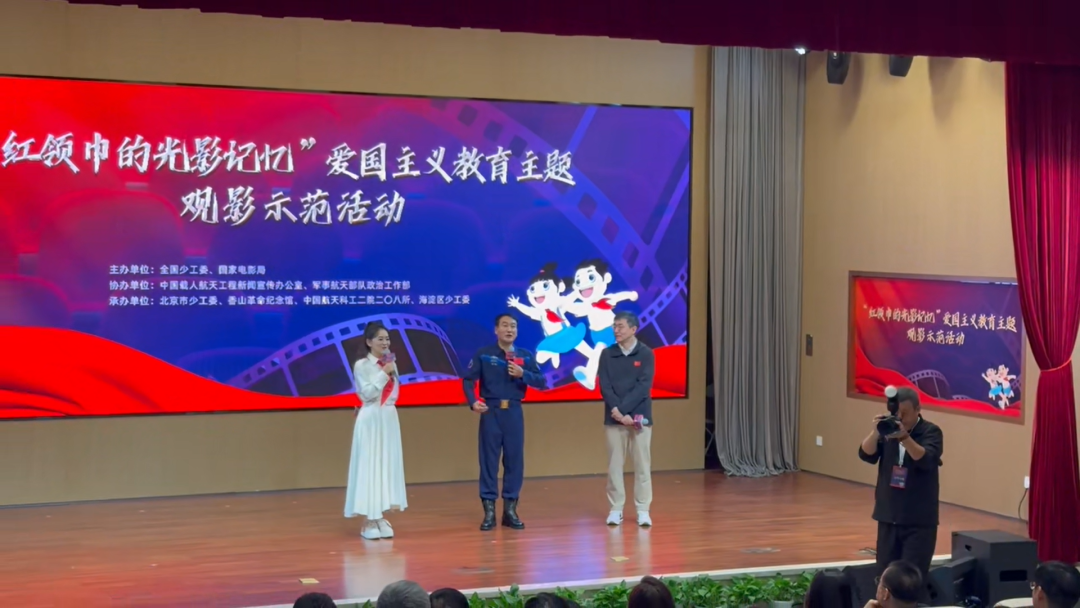 10月14日,“红领巾的光影记忆”爱国主义教育主题观影系列活动的第一站现场,来自北京市的近200名师生观看了太空电影——《窗外是蓝星》,并在观影后和航天英雄翟志刚、电影导演朱翌冉进行交流互动。