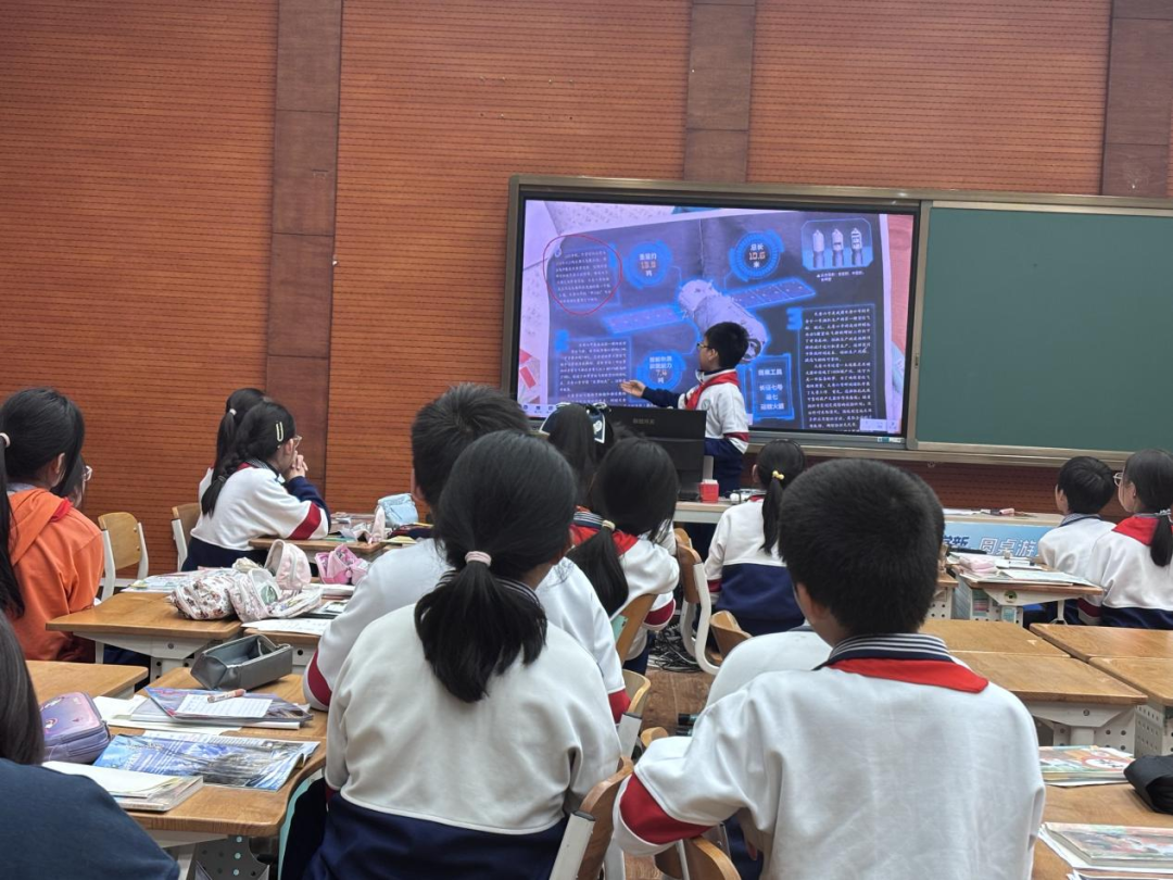 在北京景山学校远洋分校,老师让同学们从《我们爱科学》杂志中挑选优秀的内容,做一本自己的杂志。其中,一位同学给大家推荐了《“太空快递”成功上新》一文,这篇文章介绍了天舟六号货运飞船的科学知识和它前往空间站的任务,引发了其他同学的热烈讨论。