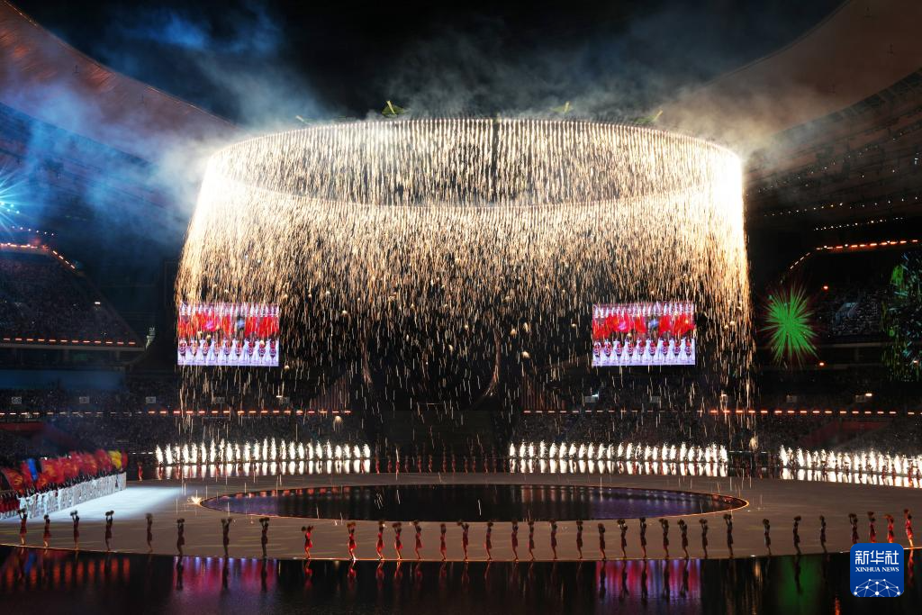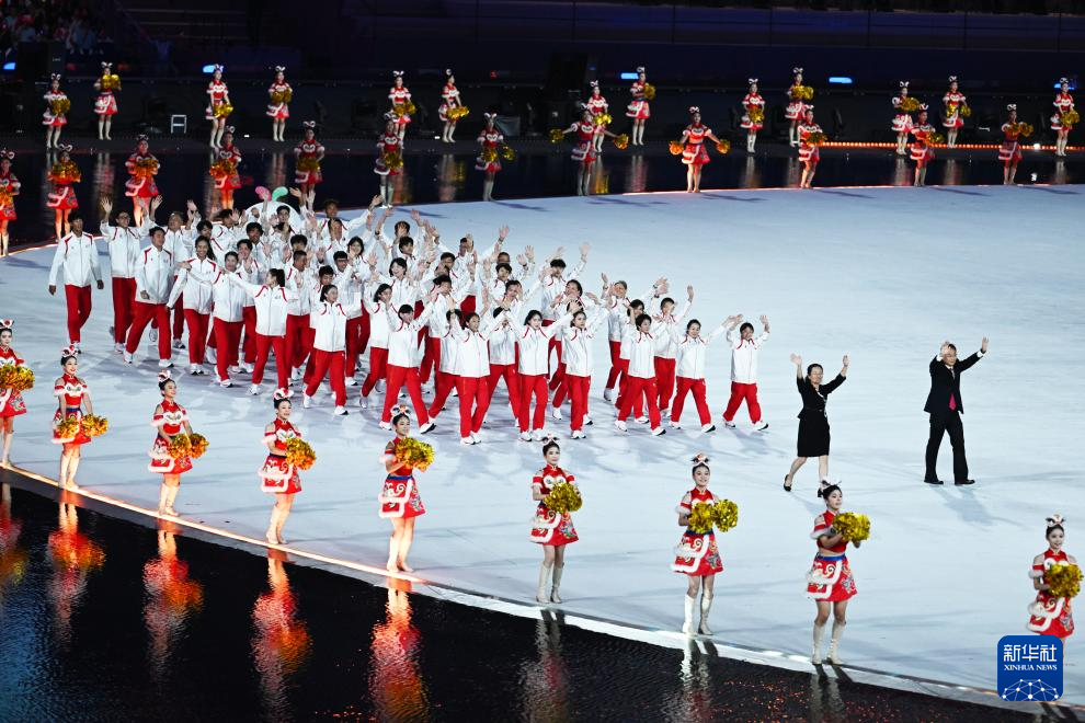 11月9日,第十五届全国运动会吉祥物“喜洋洋”和“乐融融”在开幕式现场表演。