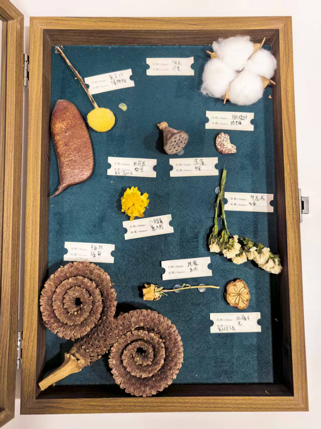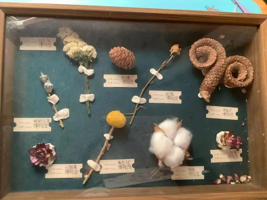 植物标本里有羊角环、薰衣草、玫瑰、松塔等各种各样的植物,我把它们一个个贴到花泥上,写上名字、来源。太有趣了!