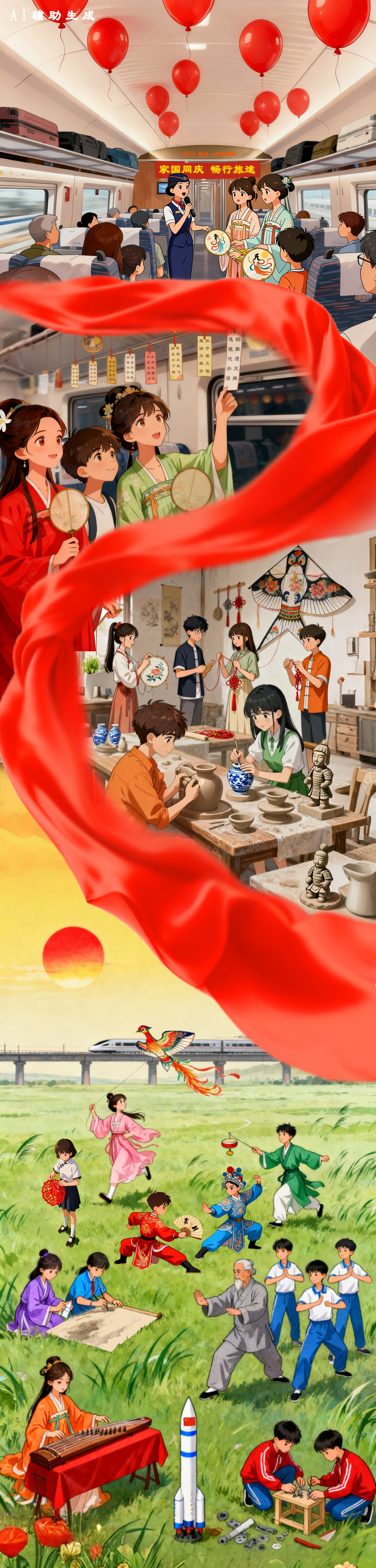 当今时代,青少年厚植文化自信拥有更为立体多元的场景。在线上,青少年透过屏幕,可以看到全国各地丰富多彩的优秀传统文化,例如潮汕英歌舞、汉中藤编、常德丝弦等非遗,既有历史的厚重感,也有创新演绎的鲜活张力、潮流表达的青春气息,获得了越来越多青少年的喜爱。在线下,社会各界也用心为青少年构建沉浸式文化体验场域。比如,中秋与国庆“双节”到来之际,在由通辽开往北京朝阳方向的G3654次列车上,国铁沈阳局沈阳客运段举办“家国同庆、畅行旅途”高铁联欢活动,让旅途成为一堂“行走的传统文化课”,让家国情怀在“流动”的空间里生根发芽。
