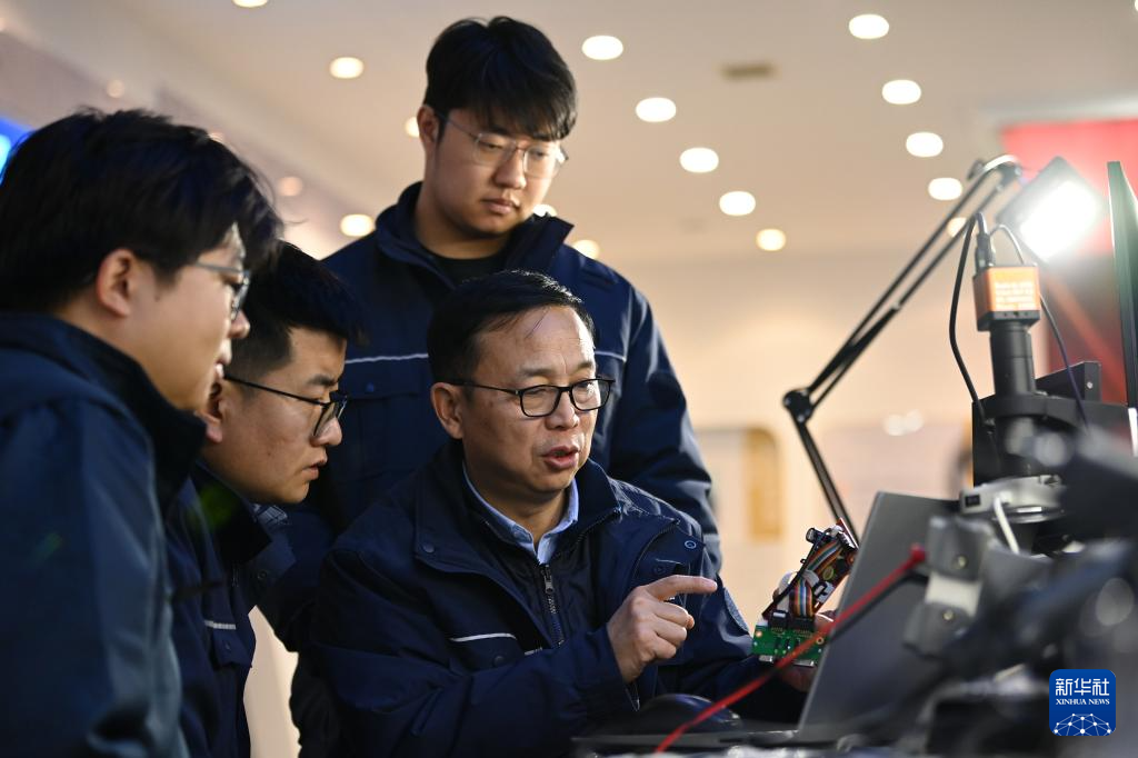 2月4日,在位于陕西省渭南市的陕西铁路工程职业技术学院实训室,董宏涛(前左一)为学生指导业务。