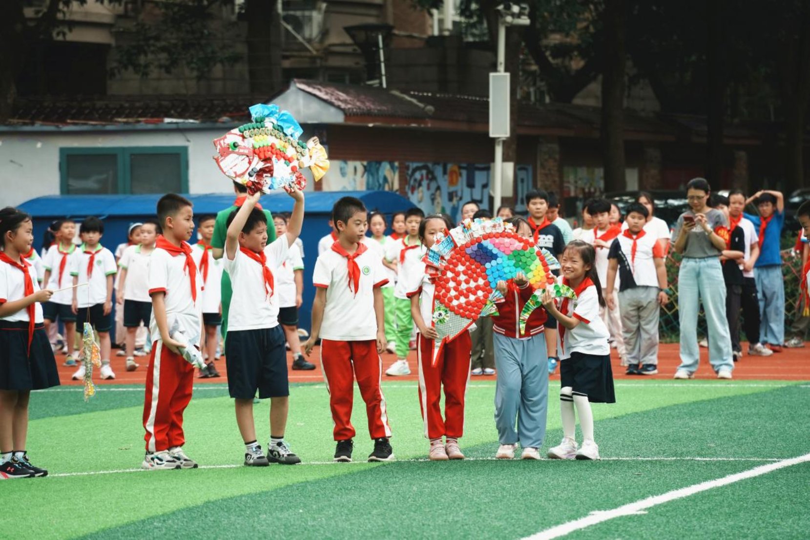 少先队员们展示制作的“无废”手工作品。(受访者供图)