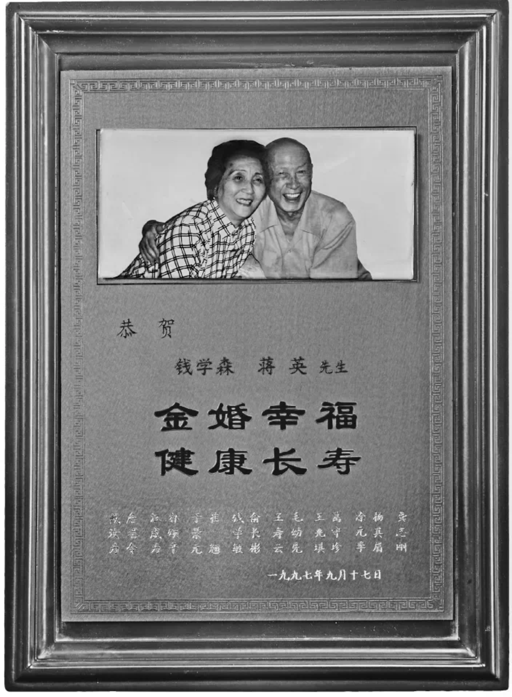 中国人一向崇尚礼尚往来。《礼记·曲礼》中有言:“礼尚往来。往而不来,非礼也。”礼物是亲朋好友或师生等维系感情、互表心意的媒介。作为受人敬仰的科学家,每逢节日、寿辰或获重要奖项,钱学森通常会收到各种礼物,赠送者既有单位或组织,也有家人、友人、身边工作人员甚至不相识的人。在钱学森接收的礼物中,单论经济价值,并无贵重之物。因为他不喜欢贵重礼物。身边人,包括钱学森的家人及工作人员因为熟知他的个性,从不送贵重礼物给他,因为送了不但不接受,反而会被批评。1997年是钱学森与蒋英的金婚之年。为了表示祝贺,在钱学森身边工作十多年的秘书涂元季,与系统学讨论小组的其他成员戴汝为、于景元、钱学敏以及其他身边的工作人员,联名赠送了一个简易纪念牌。