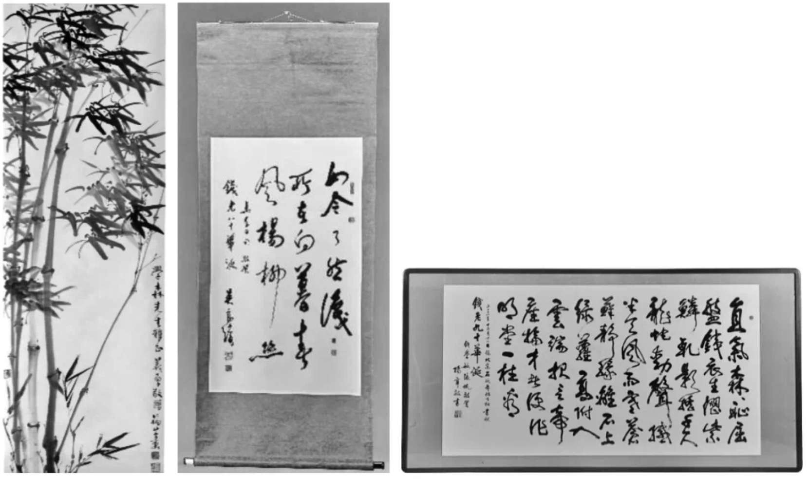 钱学森喜欢书法、字画。每逢节日或他的寿辰,很多人会送字画表示祝福。因此,馆藏中的很多字画,都是与钱学森有交往的人自书或请他人创作又赠送给他的。钱学森收到后,会通过不同方式一一表示感谢。王义勇是原北京机械科学研究院的一位教授,他的夫人刘福芳是工笔画画家。二人通过书信与钱学森交流学术及艺术。新年时,刘福芳创作了一幅工笔画梅竹,并以夫妇的名义送给钱学森以表祝福。钱学森收到后回信说:“梅轴已高悬书桌旁,我非常感谢二位。”中国科学院和中国工程院院士、清华大学教授吴良镛,曾与钱学森通过书信探讨山水城市建设。1991年钱学森80寿辰时,吴良镛手书李白的两句诗“如今了然失所在,向暮春风杨柳丝”,送给他以表心意。2001年,钱学森90寿辰时,跟他保持学术交往的钱学敏和张帆,请杨辛将北宋石延年的诗作《古松》写成书法送给他,钱学森一直将这幅字悬挂在家中。全诗如下:“直气森森耻屈盘,铁衣生涩紫鳞干。影摇千尺龙蛇动,声撼半天风雨寒。苍藓静缘离石上,绿萝高附入云端。报言帝座抡才者,便作明堂一柱看。”这也正是钱学森一生的写照。