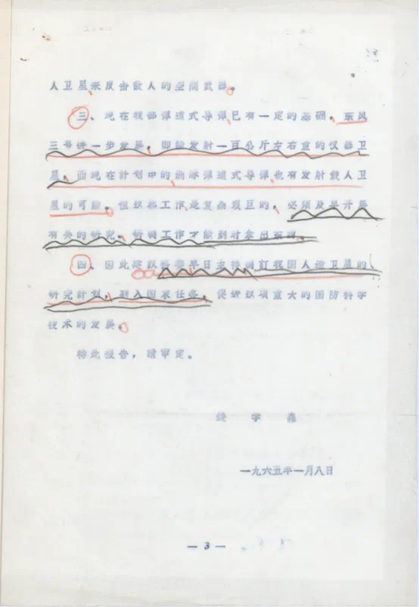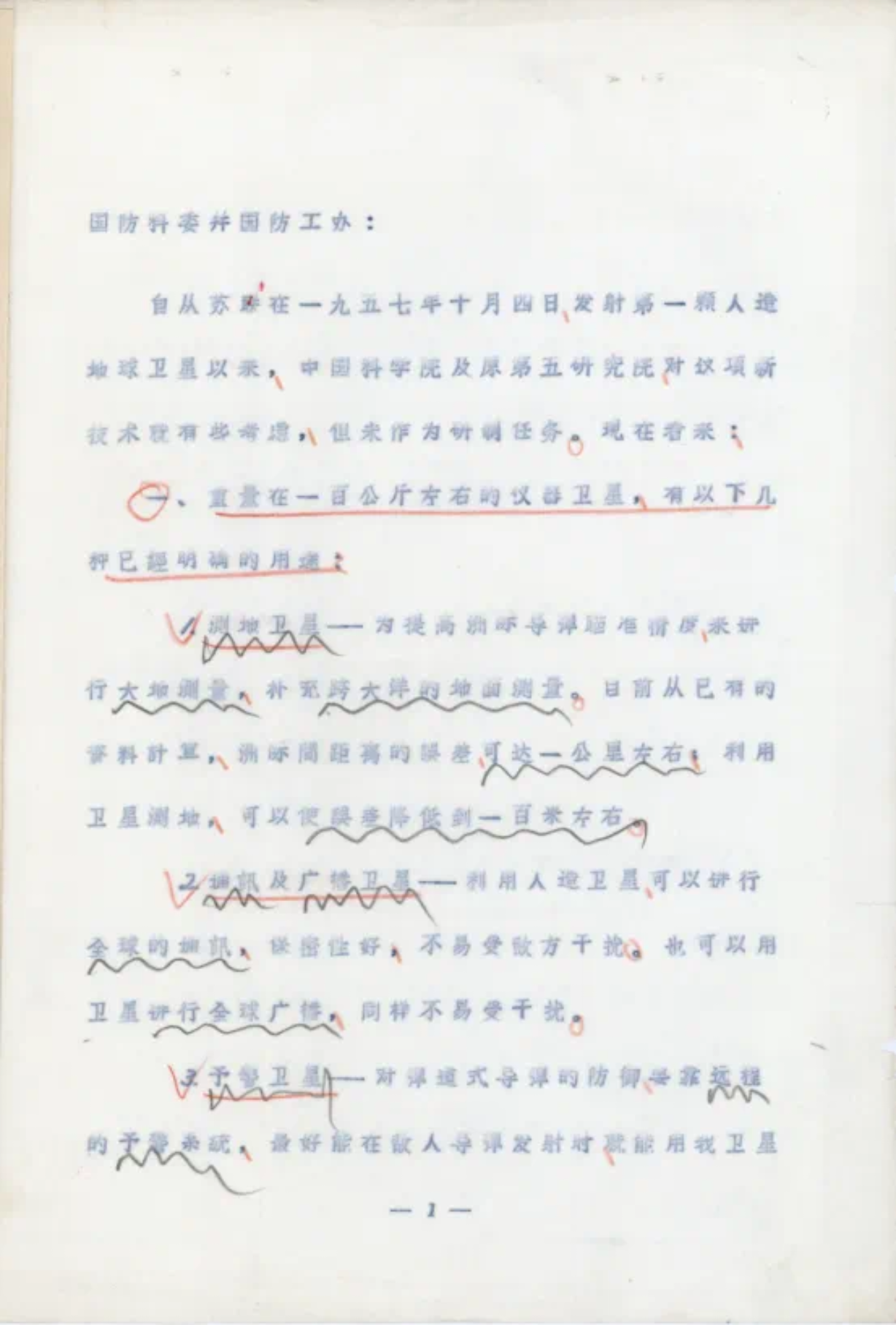 1965年1月8日,钱学森向国防科委并国防工办呈送了题为《建议早日制订我国人造卫星的研究计划并列入国家任务》的报告。报告指出:“重量在一百公斤左右的仪器卫星可以用作测地卫星、通信及广播卫星、预警卫星、气象卫星、导航卫星、侦察卫星。现在我国弹道式导弹已有一定的基础,东风三号进一步发展,就能发射一百公斤左右重的仪器卫星,而计划中的洲际弹道式导弹也有发射载人卫星的可能。但这些工作是复杂艰巨的,必须及早开展有关的研究,研制工作才能到时拿出东西。因此建议科委早日主持制订我国人造卫星的研究计划,列入国家任务,促进这项重大的国防科学技术的发展。”
