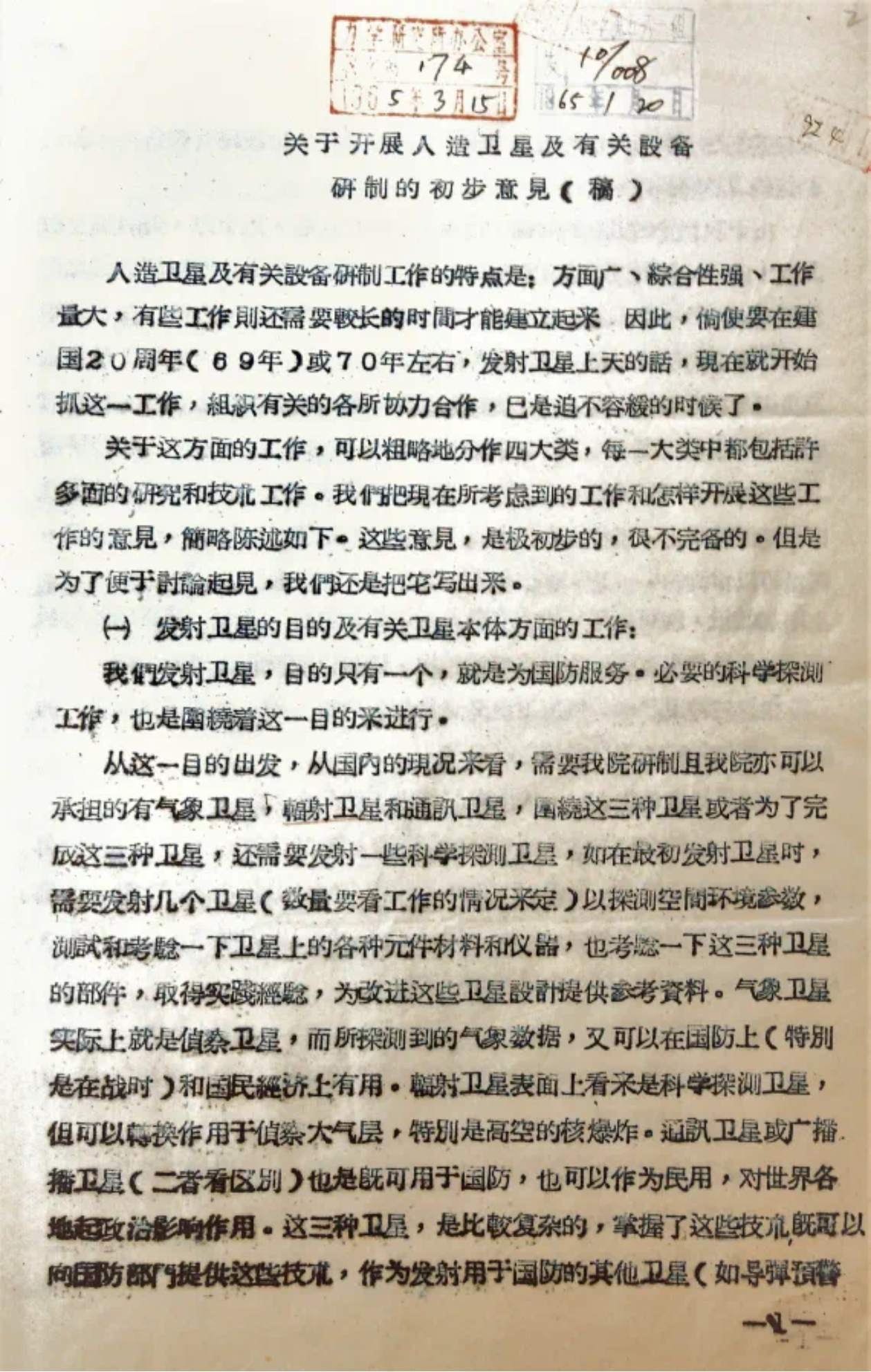 1965年1月20日,“581”组向中科院党组提交了《关于开展人造卫星及有关设备研制的初步意见(稿)》。意见稿指出:“人造卫星及有关设备研制工作的特点是:方面广、综合性强、工作量大,有些工作则还需要较长的时间才能建立起来。因此,倘使要在建国20周年(69)年或70年左右,发射卫星上天的话,现在就开始抓这一工作,组织有关的各所协力合作,已是迫不容缓的时候了。……我们发射卫星,目的只有一个,就是为国防服务。必要的科学探测工作,也是围绕这一目的来进行。”意见稿同样强调研制人造卫星对于加强国防建设的意义。中科院党组在此基础上组织力量草拟了《关于发展卫星研制工作的纲要和建议》,于1965年3月11日呈送中央专委。