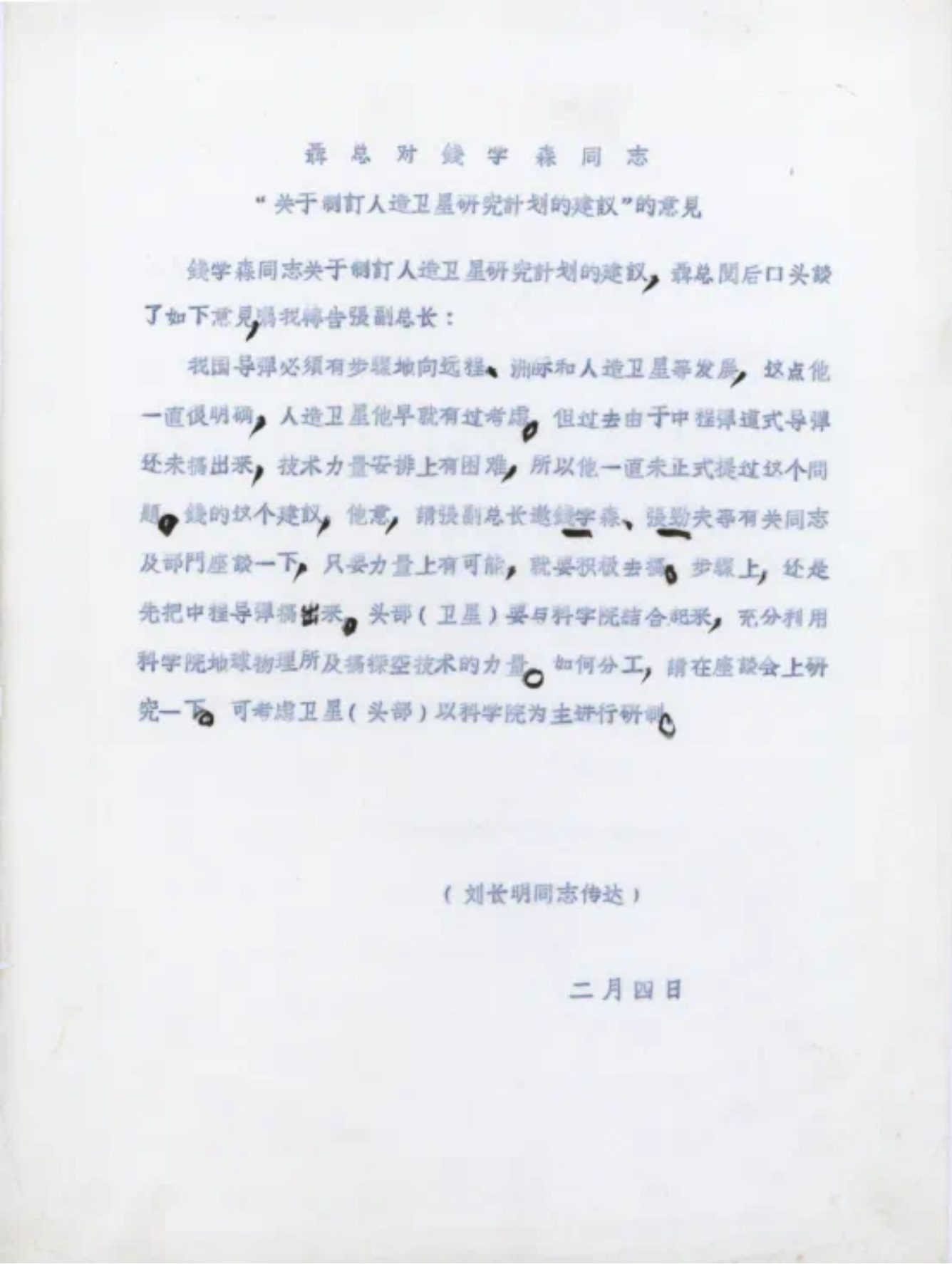 1965年2月4日,聂荣臻对钱学森的报告作了口头批示:“我国导弹必须有步骤地向远程、洲际和人造卫星发展。人造卫星早就有过考虑,但过去由于弹道式导弹还未搞出来,技术力量安排上有困难,所以一直未正式提出这个问题。钱的这个建议,他意,请张爱萍邀请钱学森、张劲夫等有关同志及部门座谈一下,只要力量上有可能,就要积极去搞。步骤上,还是先把中程导弹搞出来,作为运载工具。头部(卫星)要与中国科学院结合起来,充分利用地球物理所及搞探空技术的力量。如何分工,请在座谈会上研究一下。可考虑卫星以中国科学院为主进行研制。”2月9日,国防科委办公室将钱学森关于制订人造卫星研究计划的建议和聂荣臻的意见一起呈送总理办公室。周恩来对钱学森的建议和聂荣臻的意见非常重视,安排中央专委秘书长兼国防工办主任罗瑞卿处理此事。