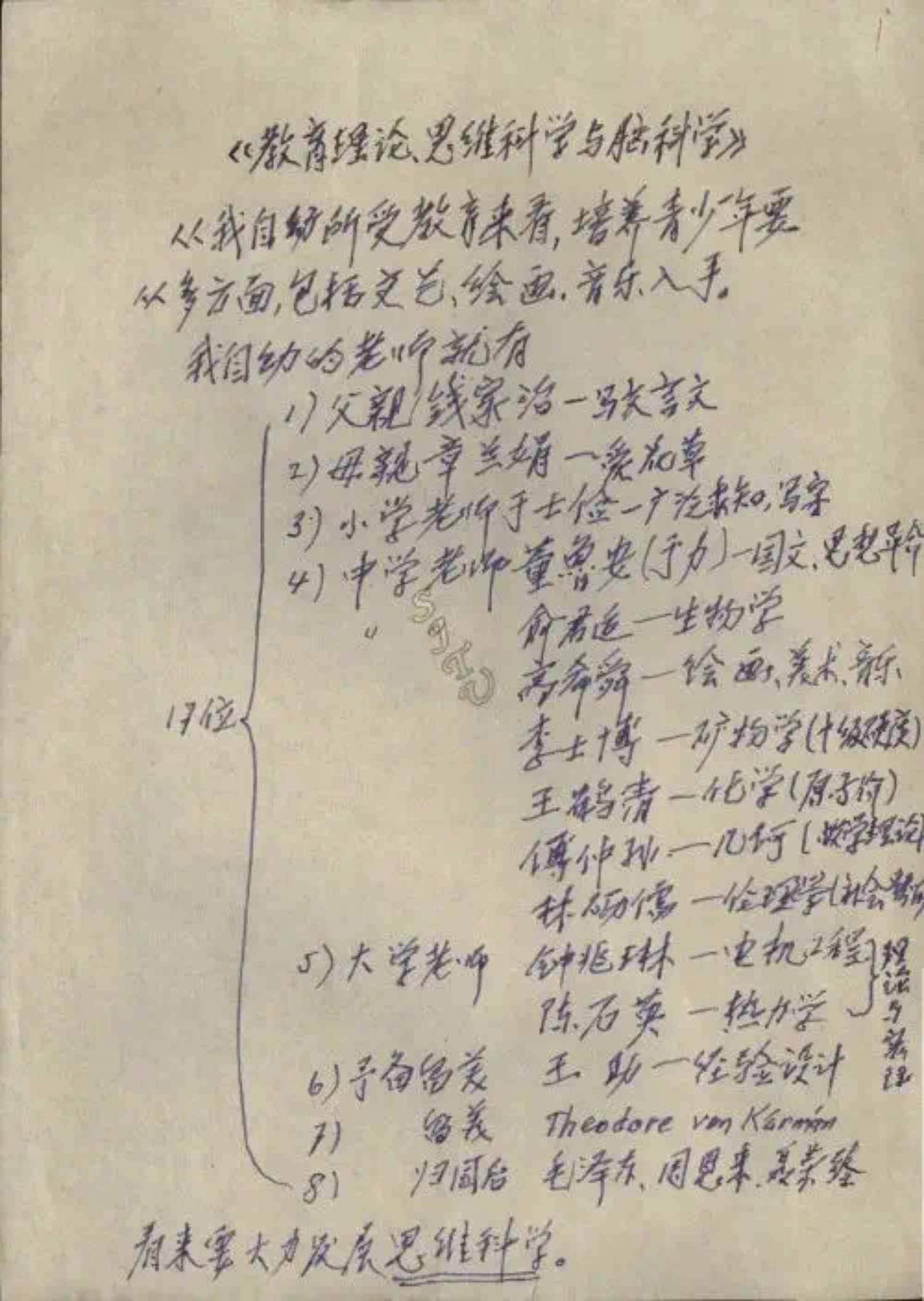 林砺儒:钱学森的伦理学老师,著名教育家,历任北师大附中主任(校长)、北京师范大学校长、中央教育部副部长;倡导全人格教育办学理念。著有《文化教育学》《伦理学要领》《教育哲学》《教育危言》等。傅种孙:钱学森的数学老师,著名数学家、教育家,曾任北京大学教授、北师大附中教务长、副校长,创办《中国数学杂志》(今《数学通报》)并任总编辑。著述颇丰,编写的《初中混合数学》发行量达数万册。俞君适:钱学森的生物老师,曾任南昌大学生物系教授。王鹤清:钱学森的化学老师,教务主任兼数化教员,著有《高级中学化学》、《高中化学实验》、《初中化学》。李士博:钱学森的矿物学老师,编写的《初中植物学》《初中动物学》《初中生理卫生学》为全国普遍采用。董鲁安:钱学森的国文(语文)老师,先后任国立北京女子师范大学教授、北京师范大学国文系副教授、河北省立天津女子师范学院国文系教授、北京私立燕京大学国文系教授。著有《修辞学》。高希舜:钱学森的美术老师,教育家、画家,曾参与创办京华美术学院,任院长兼教授;创办南京美术专科学校任校长兼教授;新中国成立后任教于中央美术学院。这样的教育为什么让钱学森终身难忘?综合以上7位老师,会发现当时的北师大附中有着教授执教(6位教授,3位校领导,最佳师资配置);专家型教师(编写教材、出版著作;其中3位是教育家);创新教育理念3大特色。北师大附中自其前身五城学堂(1901年创办)起到1930年,据不完全统计,有25位教师出版了自己的学术著作(这7位老师共编写12部),历年自行编写出版教科书23种,有的成为全国通用教材。1955年底,钱学森回国不久就到这所阔别20多年的母校看望老师。用钱学森的话来说,在北京师大附中的六年,“这是我一辈子忘不了的六年”。钱学森还说:“在我一生的道路上,有两个高潮,一个是在师大附中的六年,一个是在美国读研究生的时候。”