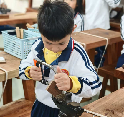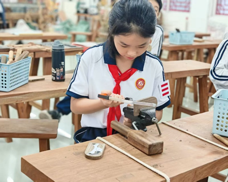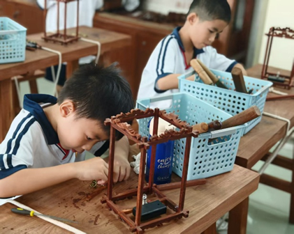 活动当天,该校教室变成了一个微型“非遗工坊”。同学们在老师的指导下,学习使用传统木工工具,从打磨、拼接再到组装,全神贯注地投入制作。五年级的陈同学仔细调整着榫卯结构,兴奋地说:“所有的木料都不用一根钉子,全靠榫卯连接,太神奇了!当最后一块木料‘咔嗒’一声卡进去的时候,感觉特别有成就感。”
