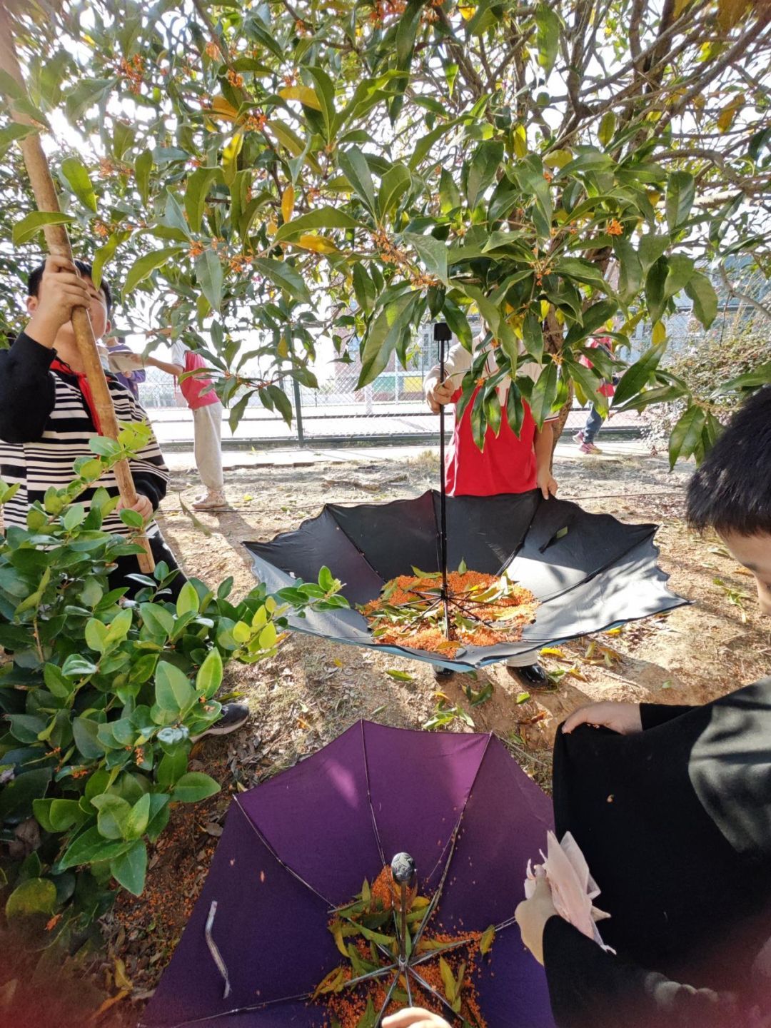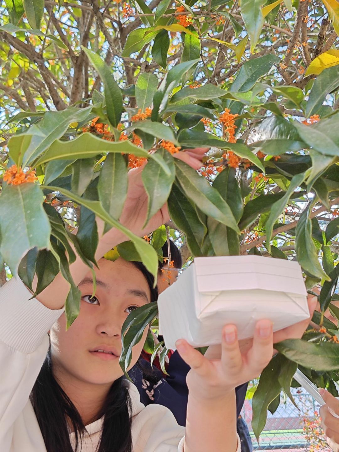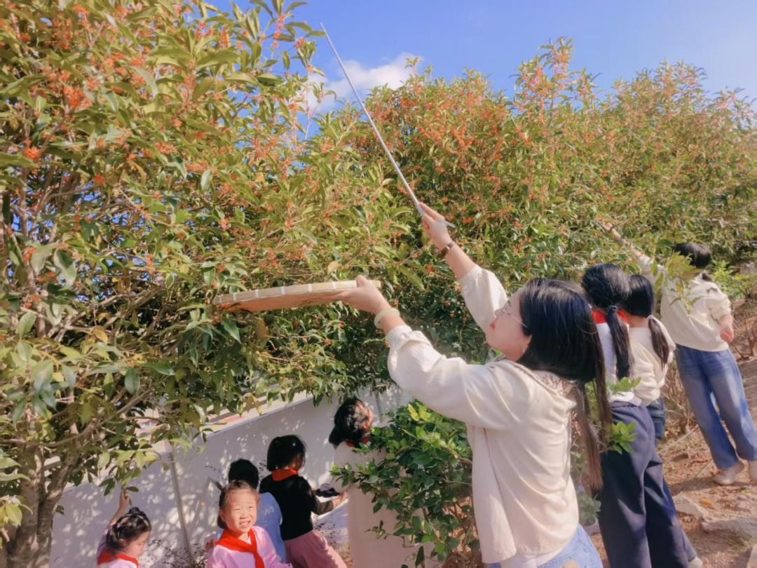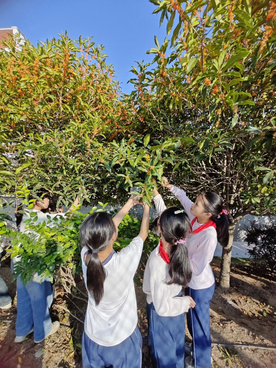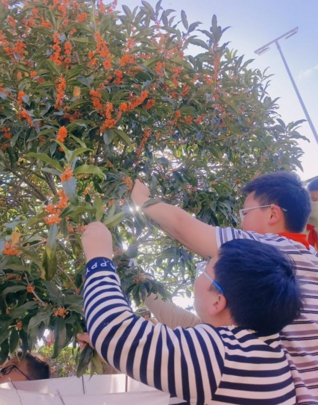 “我们分组行动,端盒子的同学要稳,采摘的同学要轻,像对待小宝宝一样爱护它们!”在老师的温馨叮嘱下,孩子们化身“护花小使者”,兴奋而小心地投入了采摘工作。吉祥队的队员们小心翼翼地轻折花枝,如意队的孩子们认真地将一簇簇金黄收入盒中。“快看!桂花好像一颗颗金色的小星星!”一个同学惊喜地叫道。“我闻到了,是甜甜的香味,像糖果一样!”丰收队的队员们一边劳动,一边分享着自己的发现。欢声笑语中,孩子们不仅收集了满盒的芬芳,更收获了分工协作的默契与爱护自然的责任心。