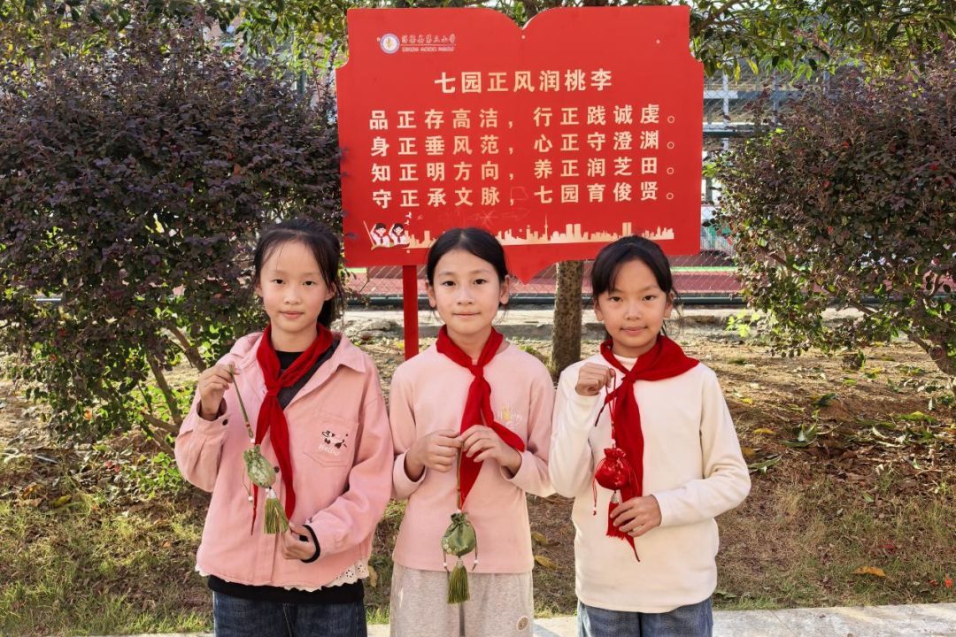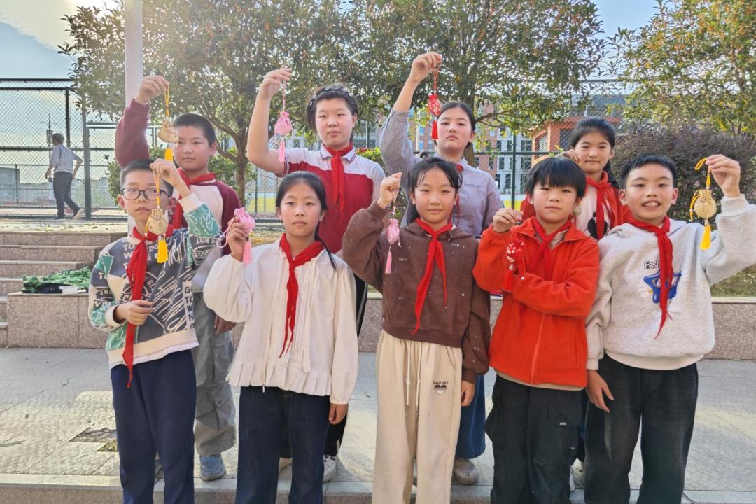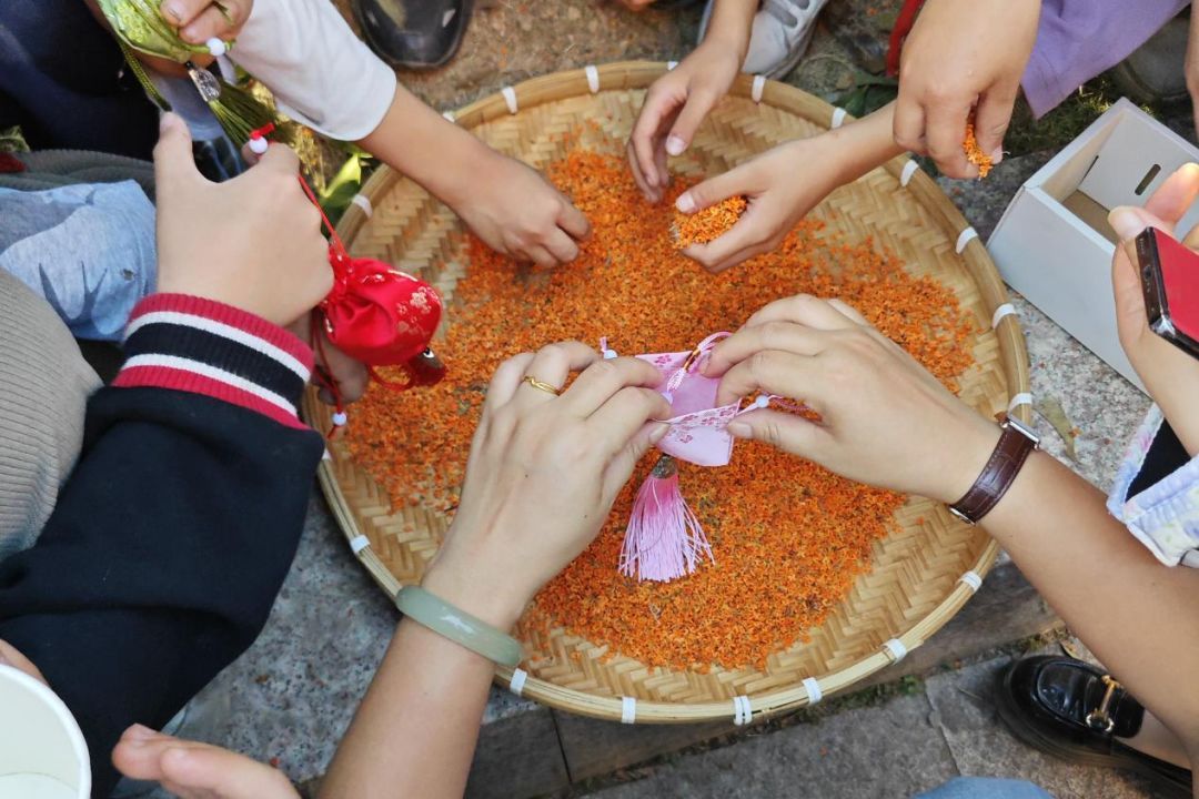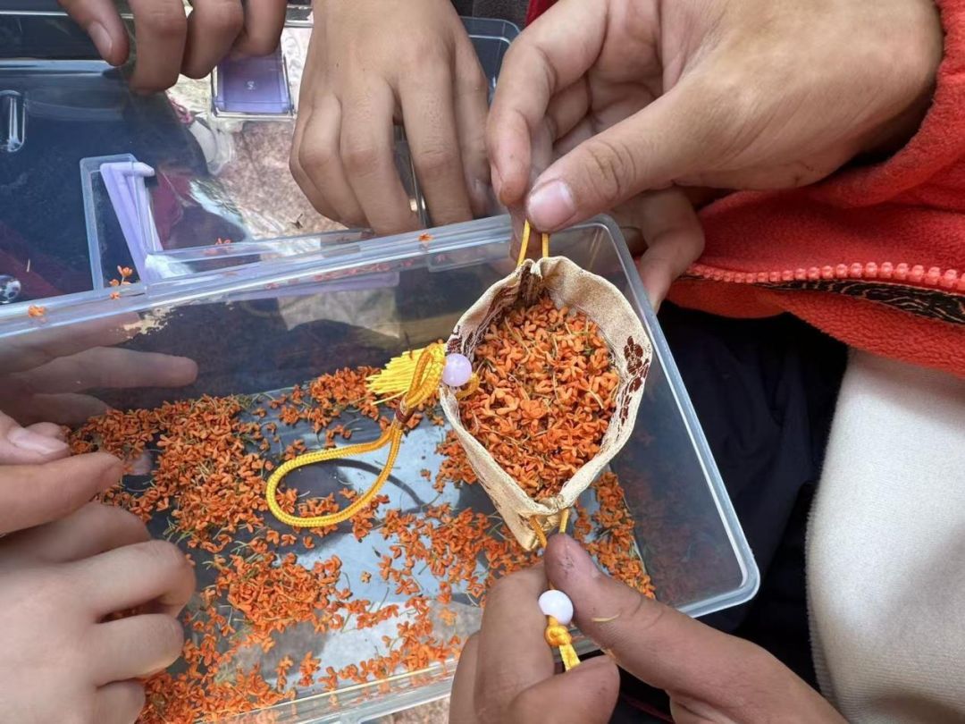 如何留住这抹秋天的味道?答案就是——制作桂花香囊!这可是最受同学们欢迎的手工环节。老师们分发了材料,大家就迫不及待地动手了。剪裁、粘贴、填充、收口……一块块普通的布料,在孩子们灵巧的小手中变身成了造型别致的祈福香囊。“老师,您看我的香囊胖嘟嘟的,装了满满的桂花!”“我的香囊是心形的,我要把它送给奶奶!”不一会儿,孩子们争先恐后地举起自己的作品,教室里成了幸福的海洋。老师动情地说:“孩子们,传统的香囊承载着健康平安的祝福,愿你们也如这桂花般,生命芬芳,快乐成长!”这一刻,非遗文化的种子,悄然种在了孩子们心田。