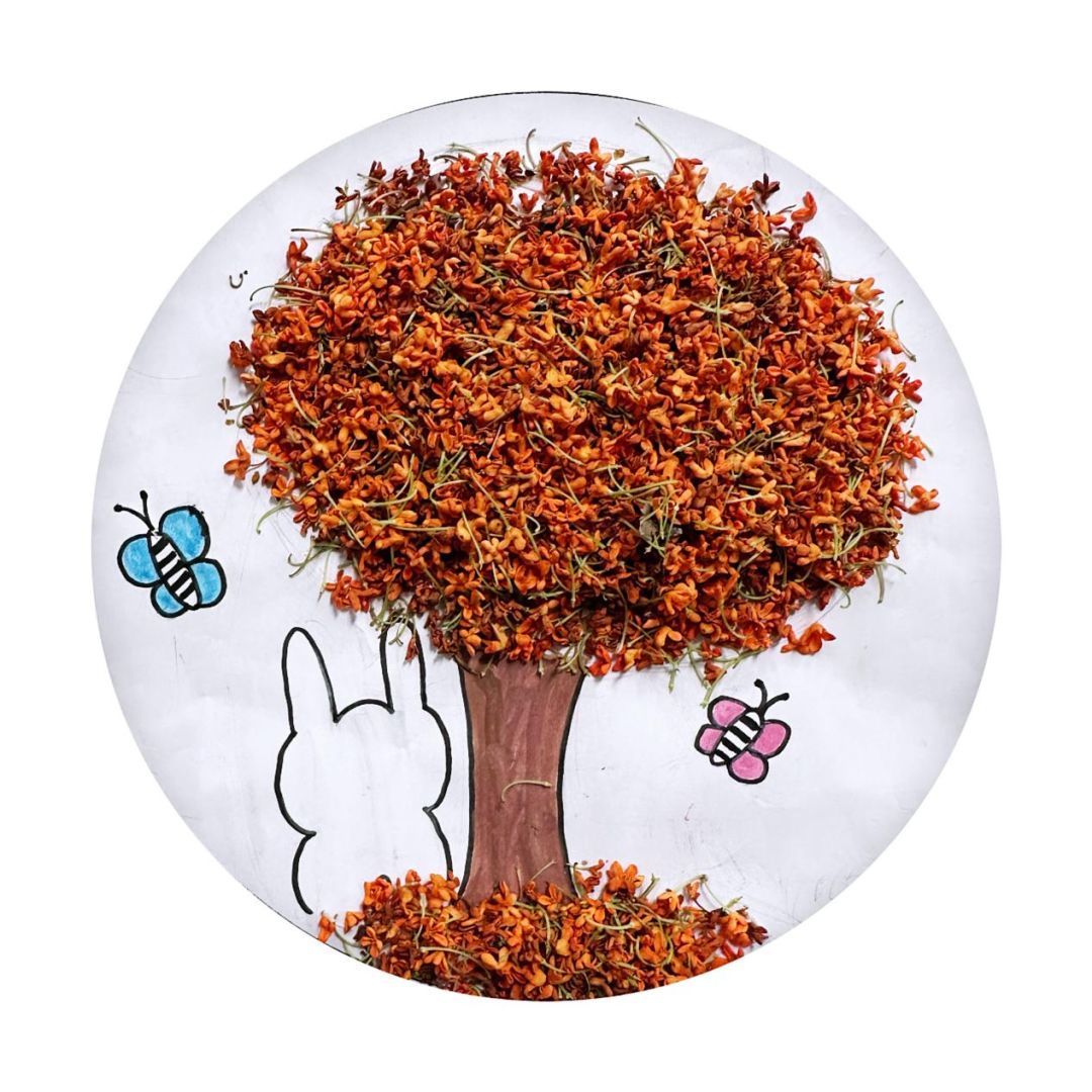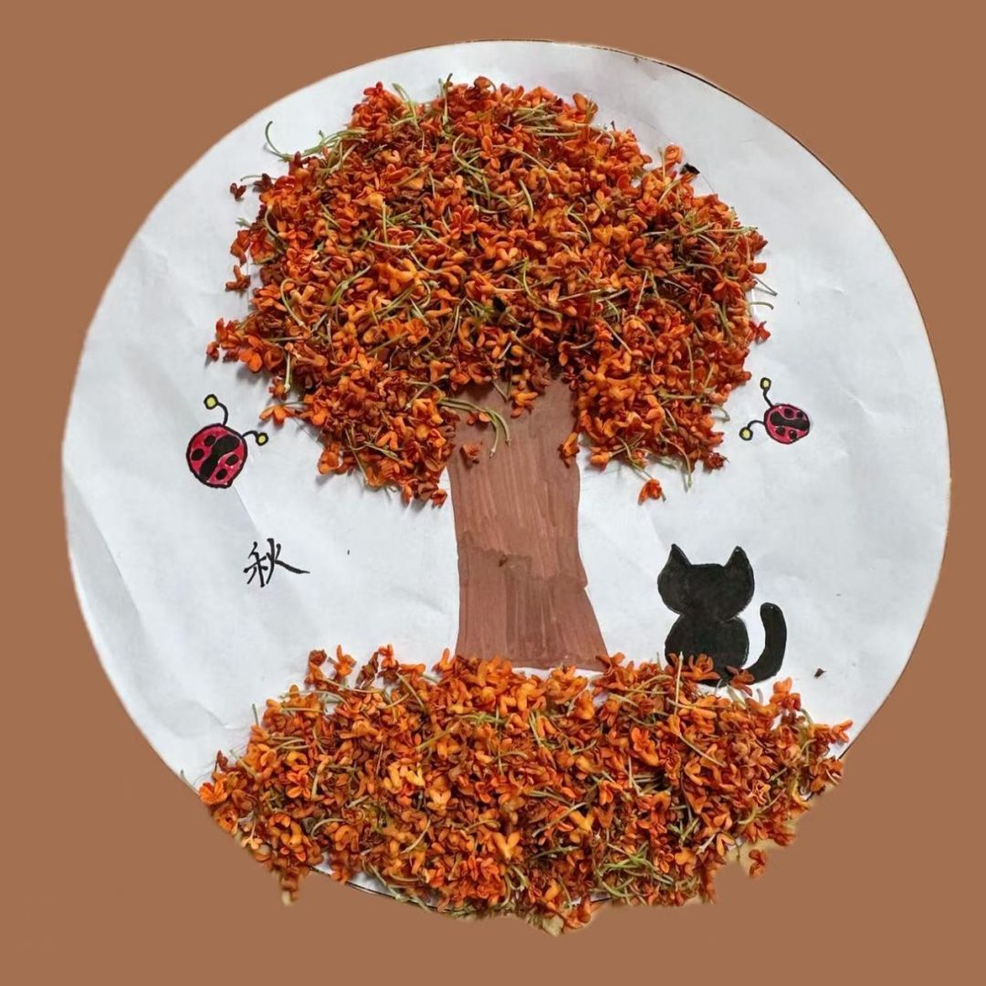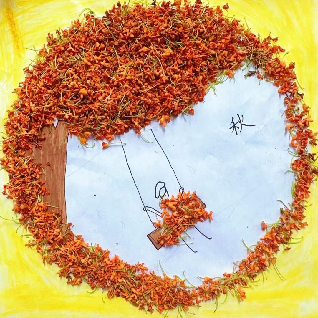 同学们的创意持续迸发,桂花成为了这场艺术创作的核心主角。大家或提笔勾勒桂花的灵动姿态,细致描绘花瓣的层次与神韵;或细心收集被秋风吻过、悄然落地的桂花,在美术纸上赋予其新的生命。大家用胶水作画,将桂花作为最特别的“颜料”,拼贴出小熊、花朵、小树等一幅幅充满想象力的艺术作品,用独特的方式将秋天的美好永远定格。
