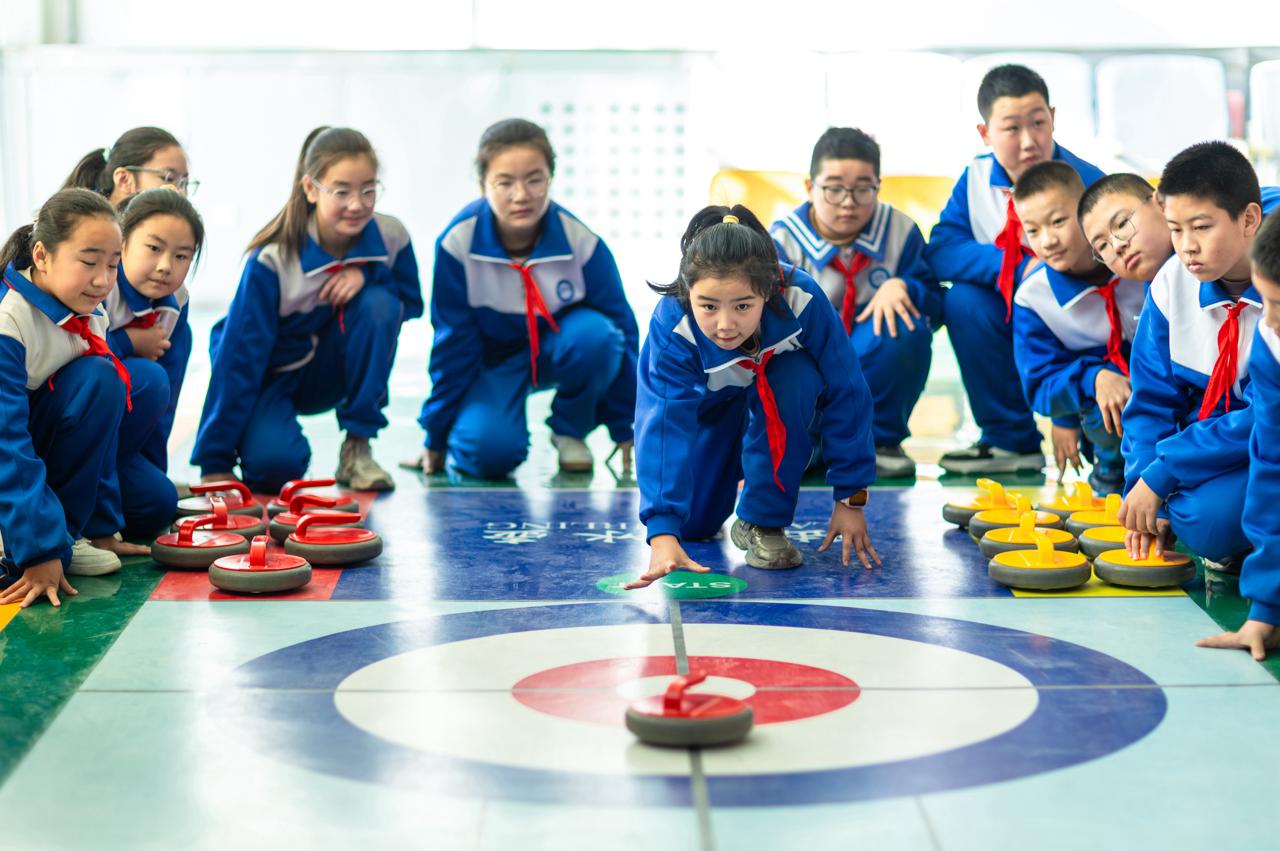 在甘肃省张掖市第一中学,学生们正在练习旱地冰壶。通讯员 杨潇 摄