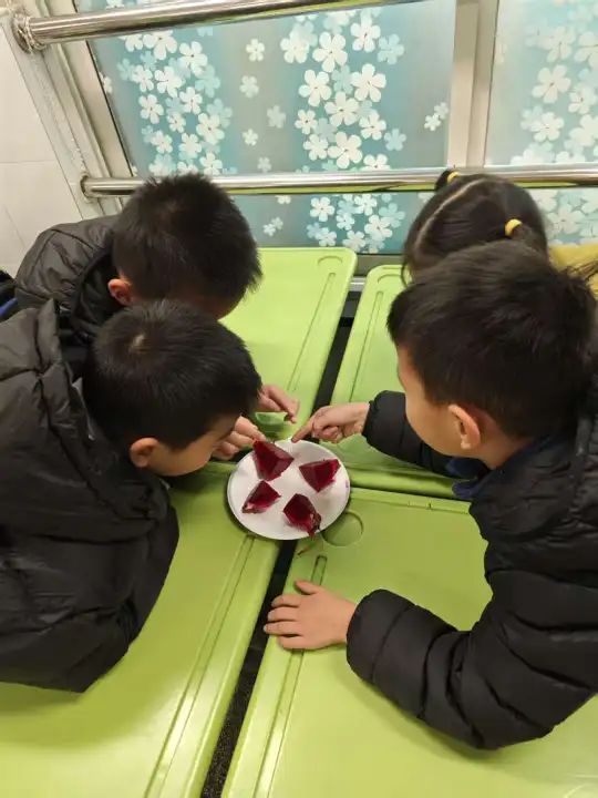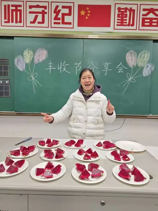 回到教室,“火龙果派对”开始啦!老师把果子切成小块,甜甜的果香飘满教室,大家拿着小叉子,你喂我一口,我递你一块,这些都是我们的“劳动小甜果”!”教室里全是甜甜的笑声。