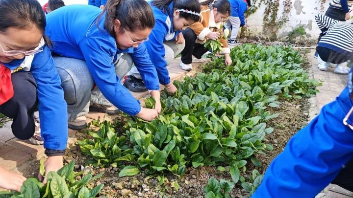 同学们当起“采摘小能手”:菠菜要抓住根轻轻拔,青菜要用铲子松松土再提,香菜要一株株小心摘。大家一边摘一边分享技巧,手里的袋子很快就装满了,泥土的香味混着蔬菜的清香,好闻极了!