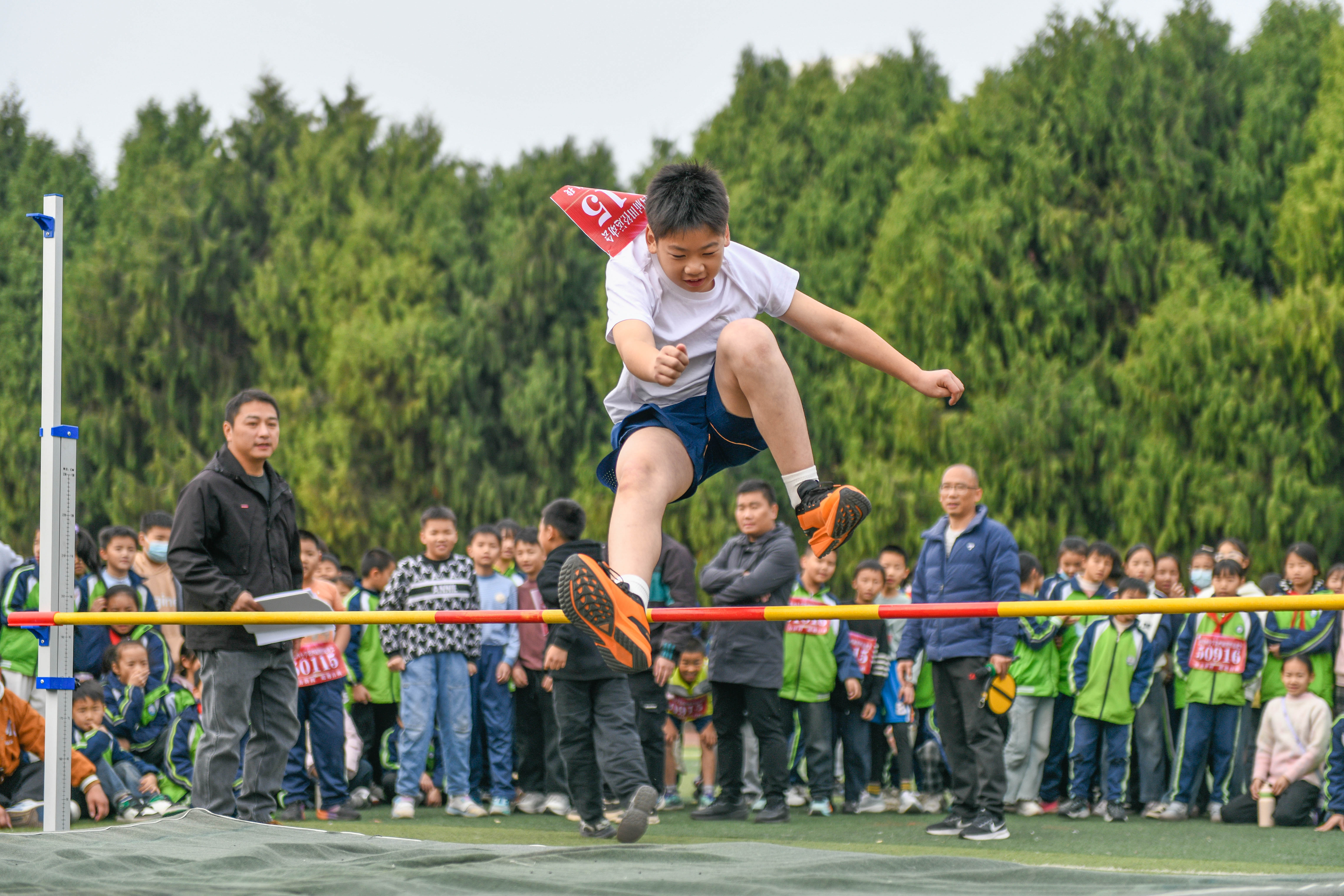 湖南省永州市道县第四小学学生在参加跳高比赛。 通讯员 蒋克青 陈敏敏 摄