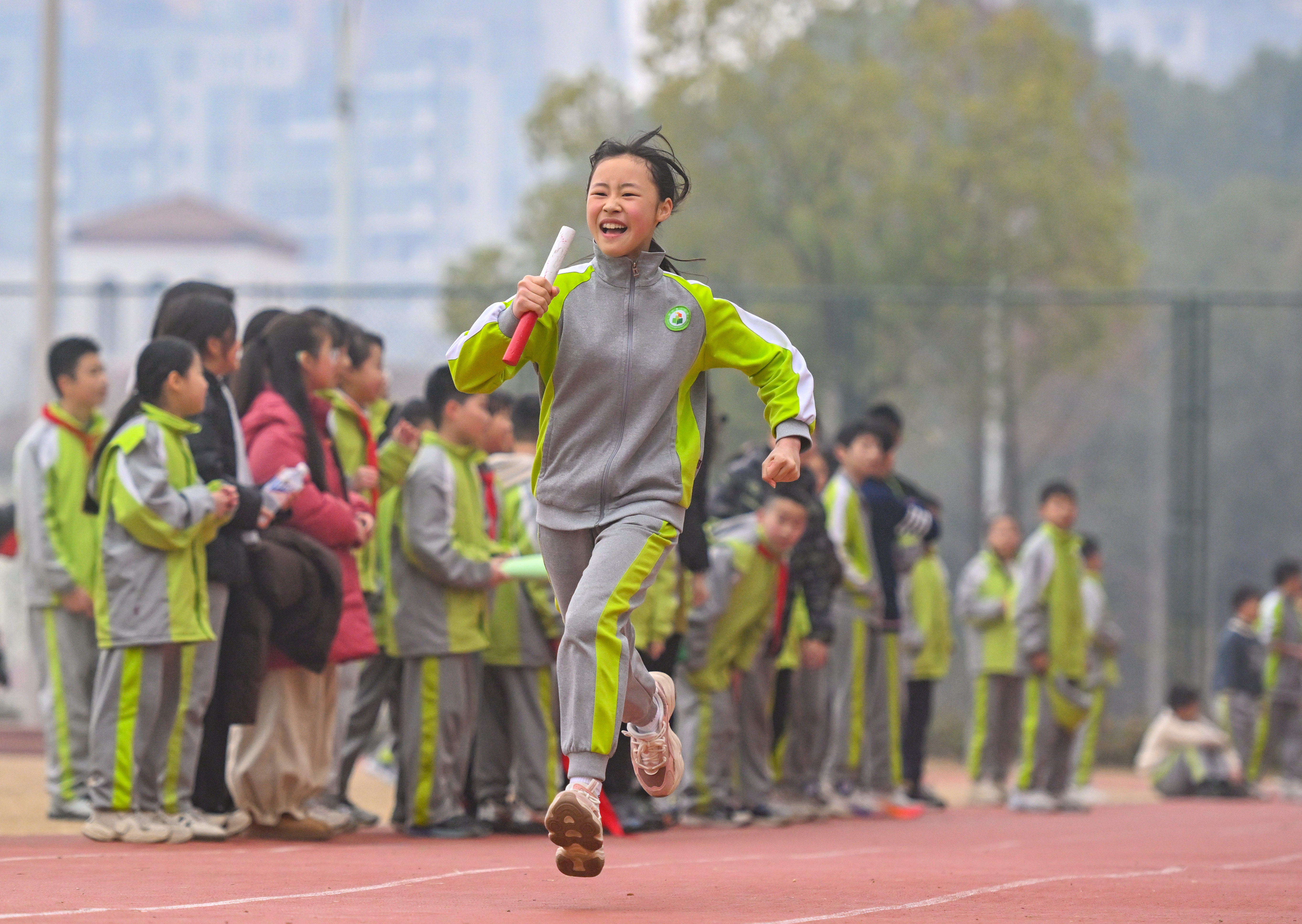 在湖南省长沙市开福区新竹第二小学,学生在进行班级迎面接力赛跑。