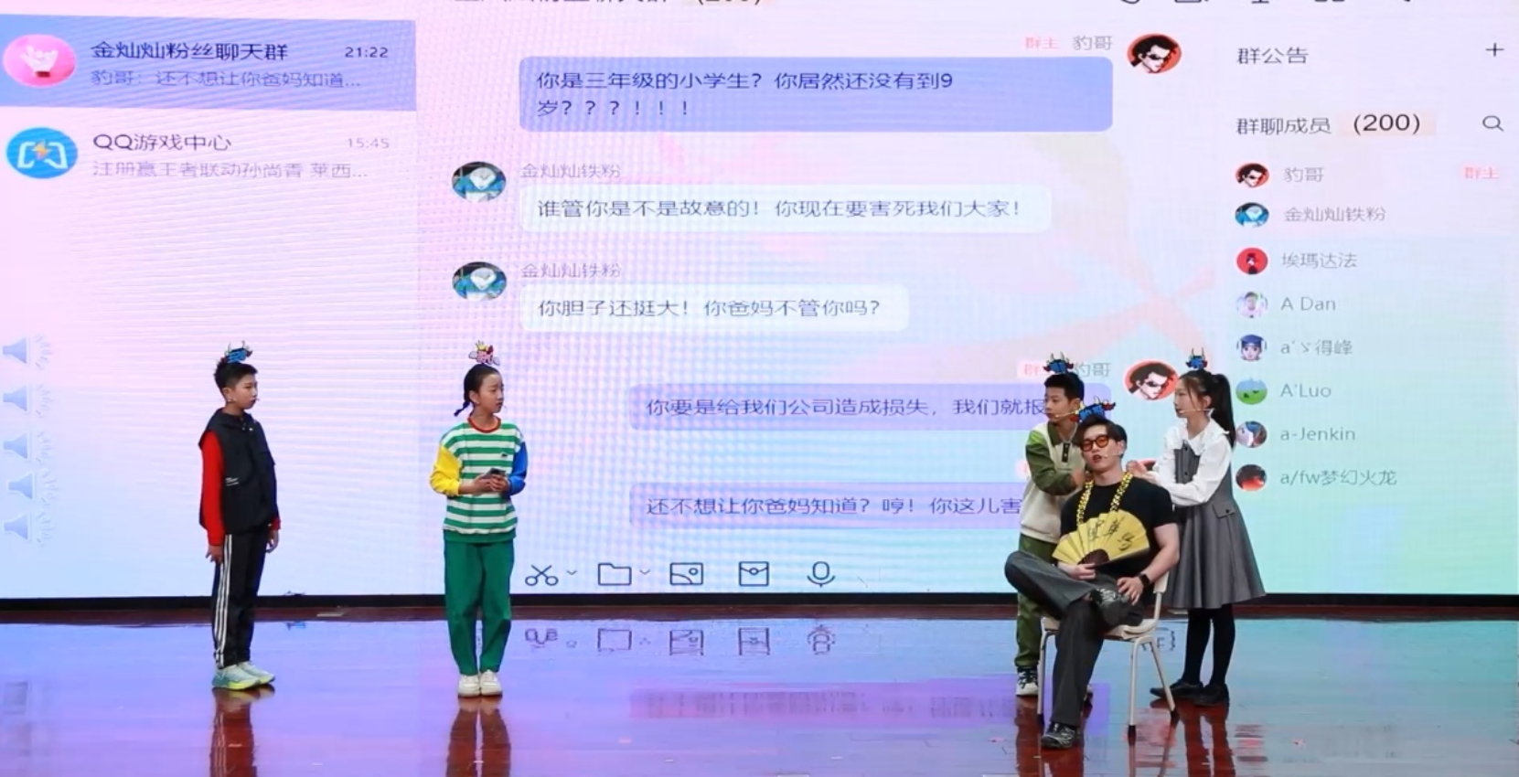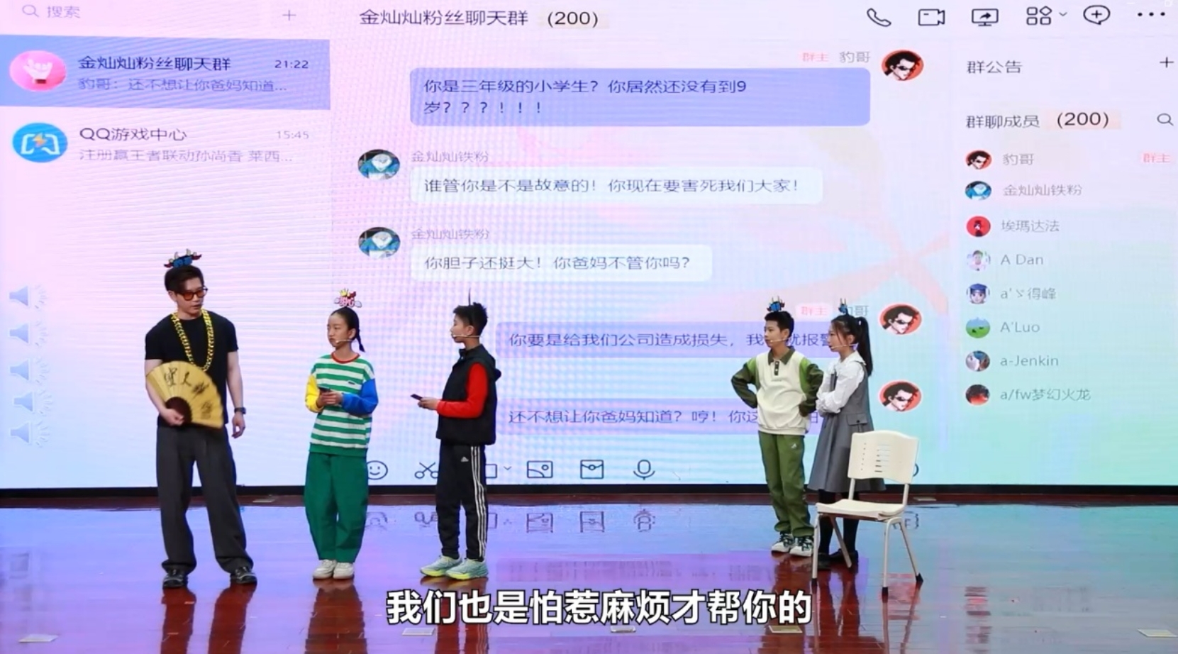 剧中的萱萱是大明星金灿灿的超级粉丝,看到“加QQ群看明星直播”的消息,就赶紧进了群。群主让她转10元钱才能看直播,萱萱付了钱后,却被说“未成年支付违法”,还要让警察抓她的爸爸妈妈!害怕的萱萱只好按要求买了7600元的电子购物卡,最后不仅没看成直播,购物卡也全都不能用了,原来这些都是骗子们的圈套!