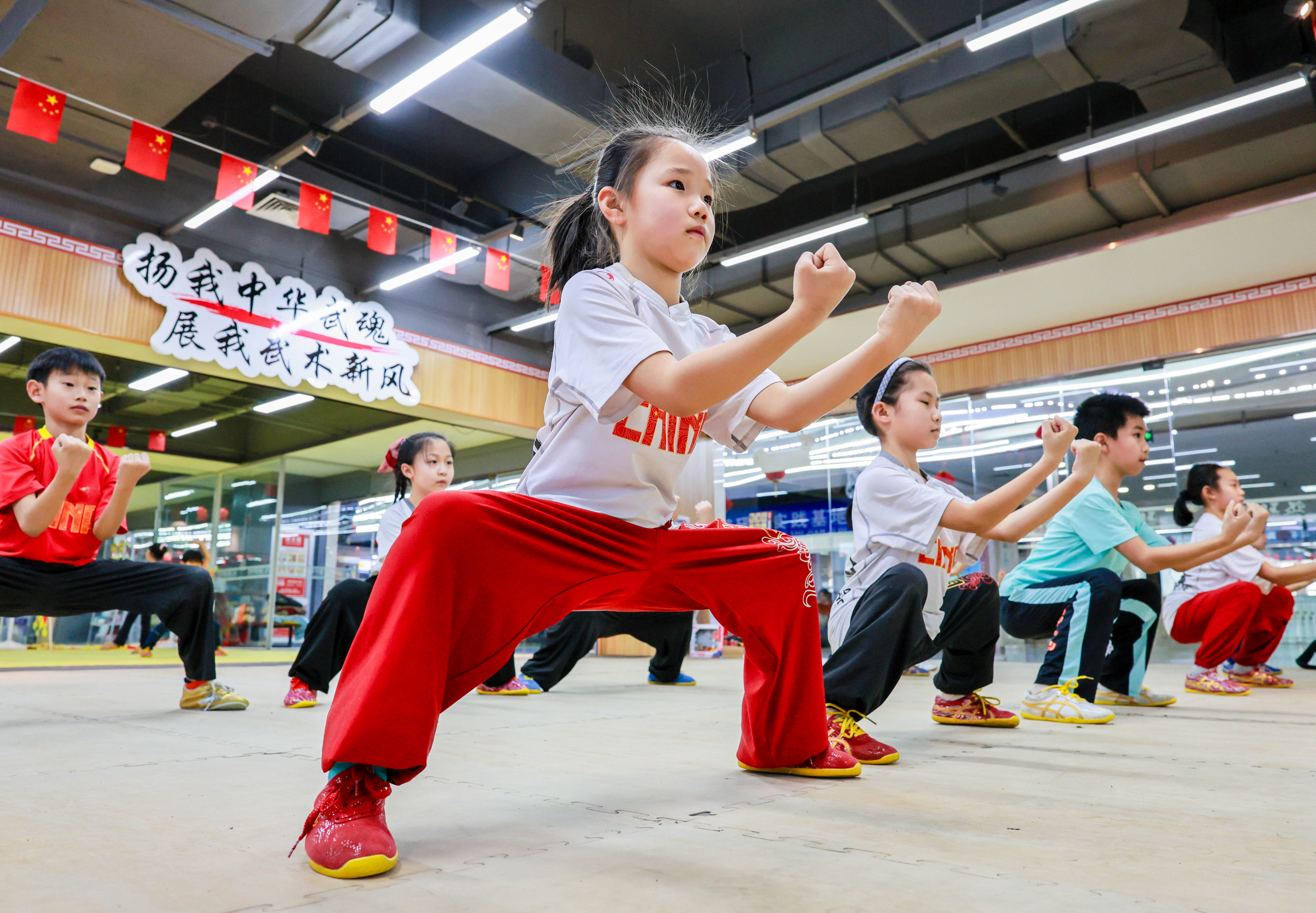内蒙古呼和浩特市玉泉区青少年宫武术馆内,小朋友们在练习武术基本功。通讯员 丁根厚 摄