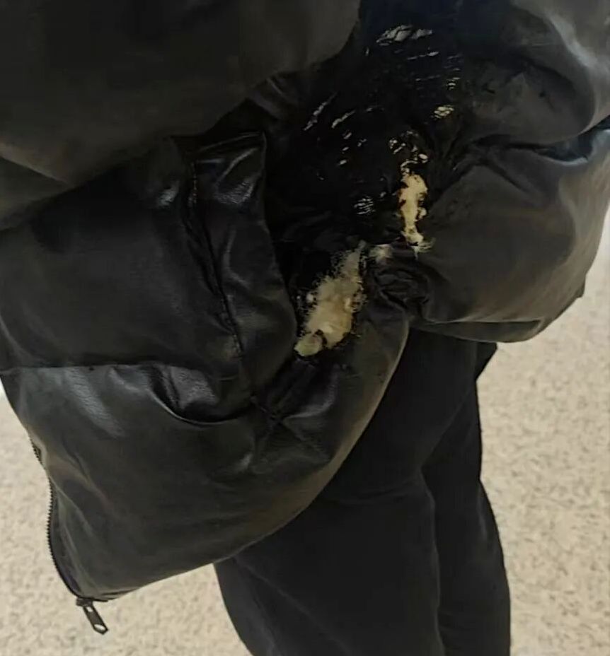 明火将该乘客外套的口袋处烧穿,衣物一侧出现明显破损。