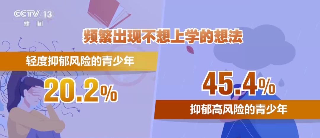中国科学院心理研究所今年发布的《心理健康蓝皮书:中国国民心理健康发展报告(2023—2024)》显示,青少年有抑郁或焦虑风险时,有更高比例频繁出现不想上学的想法。在轻度抑郁风险和抑郁高风险的青少年中的这一比例分别高达20.2%和45.4%。