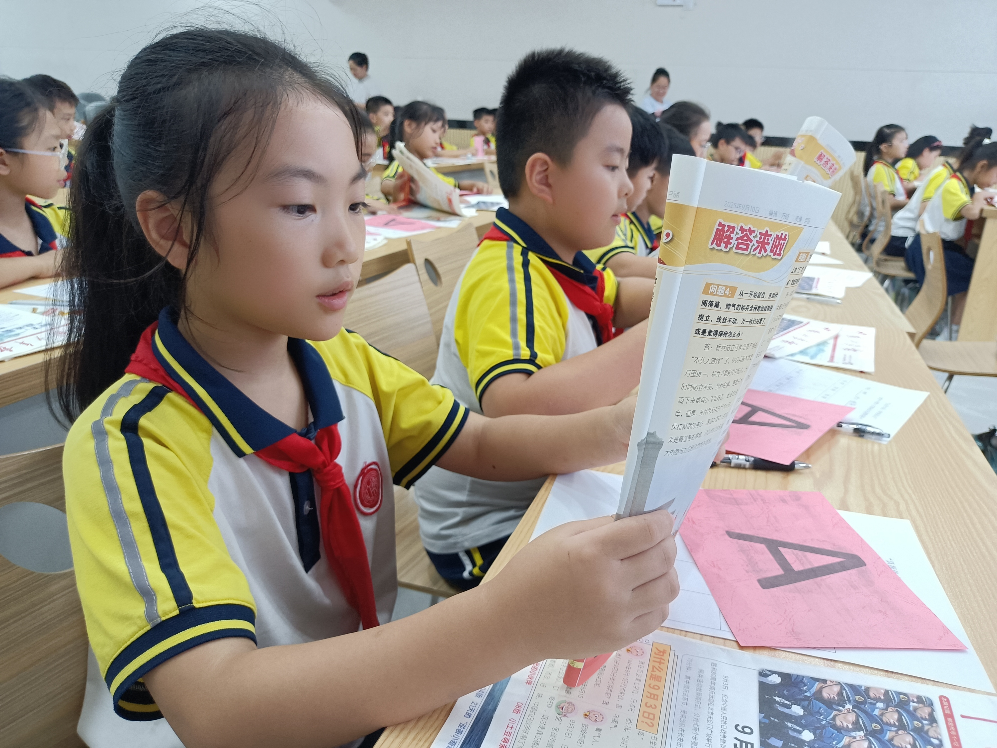 竞赛围绕《中国少年报》内容设置题目,涵盖少先队知识、时事热点、科技文化等方面。来自各个中队的74名队员积极参与,现场气氛热烈。当熊老师念出第一道题时,整个会场安静得能听见自己的心跳。答对的同学会“哇”地松一口气,开心地晃着脑袋;答错的小伙伴则不好意思地吐吐舌头,赶紧把正确答案记在小本子上。