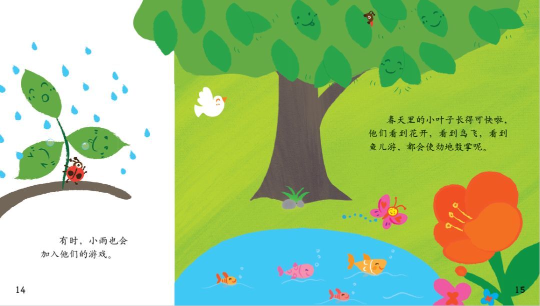 春天里的小叶子长得可快啦,他们看到花开,看到鸟飞,看到鱼儿游,都会使劲地鼓掌呢。