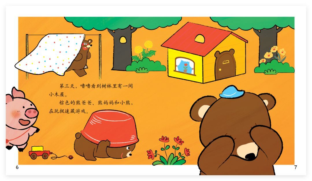 棕色的熊爸爸、熊妈妈和小熊,在玩捉迷藏游戏。