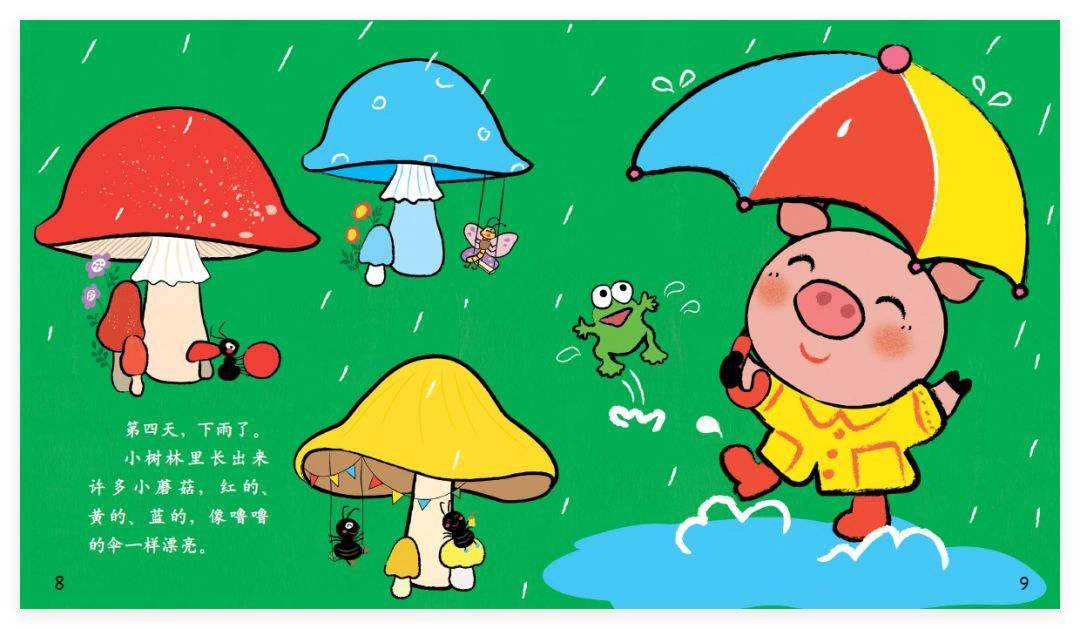 小树林里长出来许多小蘑菇, 红的、黄的、蓝的, 像噜噜的伞一样漂亮。