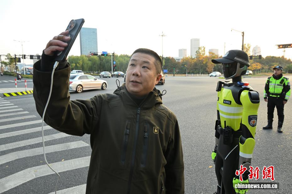 12月3日,市民和AI交通管理机器人自拍合影。近日,浙江杭州交警推出AI交通管理机器人“杭行1号”,该机器人可根据交通信号灯做出标准指挥动作,并依托视觉识别分析技术及时发现非机动车违法行为,进行劝导,以科技赋能交通管理。