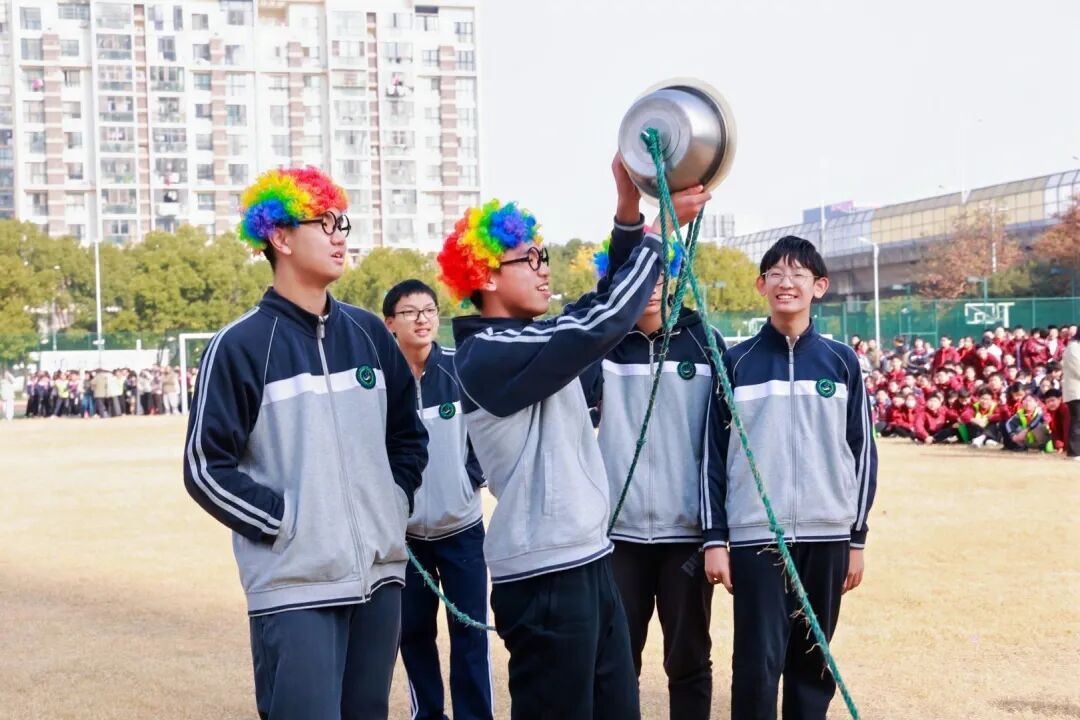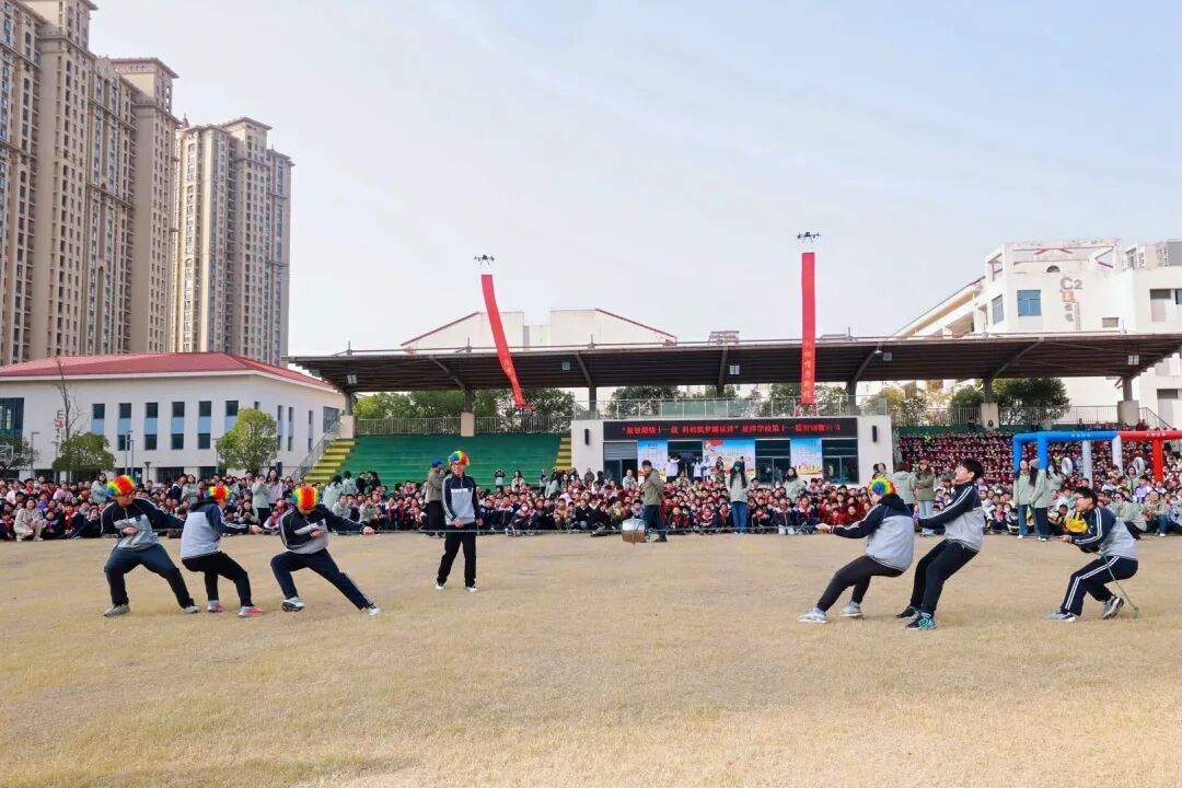 马德保半球拔河比赛更是将氛围推向高潮,紧紧相拥的“铁兄弟” 在大气压强的作用下纹丝不动,随着同学们通力合作、奋力拉扯,一声巨响后半球分离,全场爆发出雷鸣般的掌声,生动诠释了团队力量与科学原理的双重魅力。