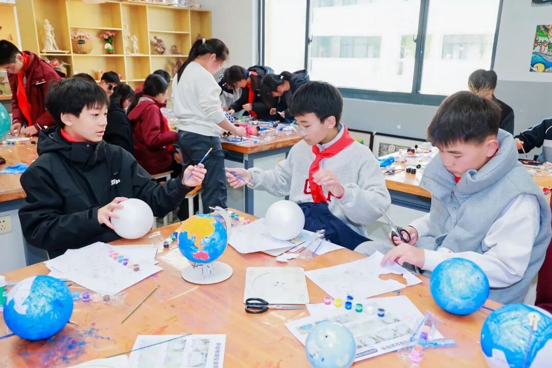 数学学科的“数理迷局”“魔方矩阵”“数独迷城”着重训练逻辑与空间思维;物理组的“光影筑梦家”“离子动力先锋号”“空气炮”让光学、电学、力学知识生动可视;化学、生物的“皂梦空间”“无患子造物记”“蚕丝造物记”则将实验室延伸到生活场景;地理、美术、音乐等学科也通过“星穹云游”“扭扭棒变形记”“AI音乐魔法师”等活动,展现了人文艺术与科技创新的美妙结合