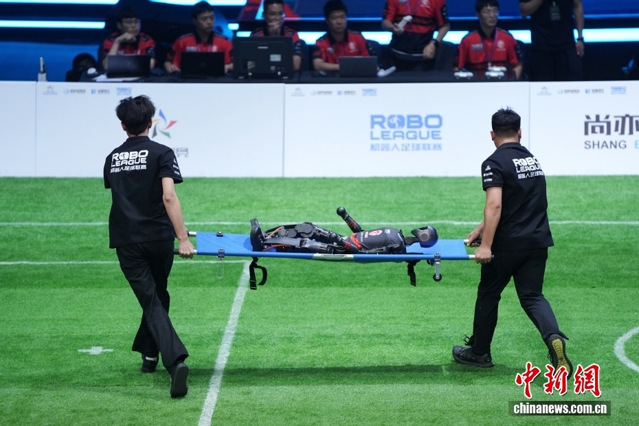 从4月全球首个人形机器人半程马拉松在北京亦庄鸣枪开跑,到8月国家速滑馆“冰丝带”迎来世界人形机器人运动会,再到10月首届中国(国际)机器人辩论大赛上演“人机思辨”——这一年,人形机器人从实验室迈入现实场景,以“量产元年”之势完成了从运动耐力到智能交互的全面跨越。从产线到展厅,从秀场到赛场,多场景、多任务的验证,正将一个人形机器人规模化应用的未来推到我们眼前。图为6月28日,在北京举行的中国首场机器人足球3V3 AI赛中,北京信息科技大学Blaze光炽队的机器人在比赛中“受伤”被抬出。