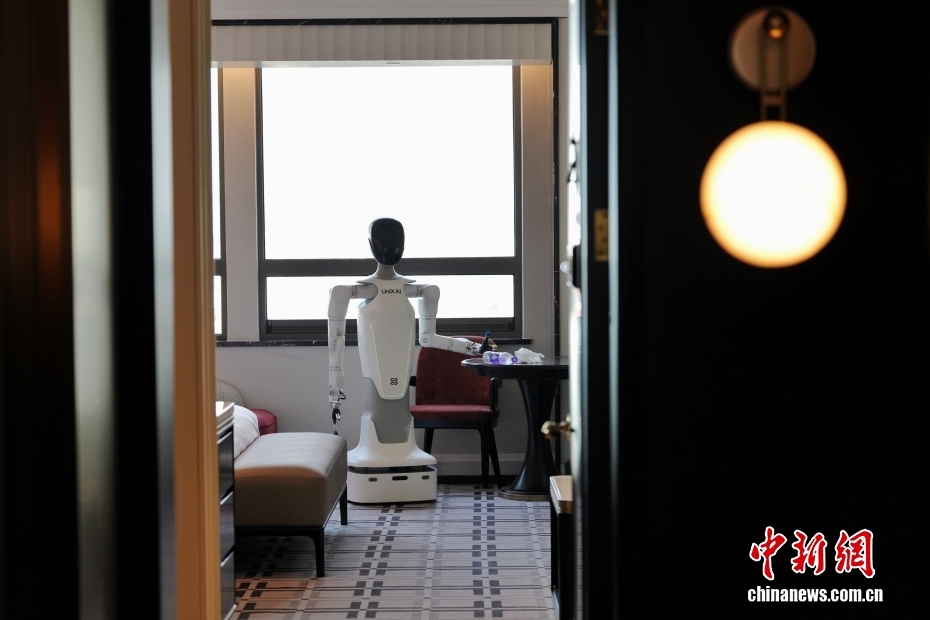 从4月全球首个人形机器人半程马拉松在北京亦庄鸣枪开跑,到8月国家速滑馆“冰丝带”迎来世界人形机器人运动会,再到10月首届中国(国际)机器人辩论大赛上演“人机思辨”——这一年,人形机器人从实验室迈入现实场景,以“量产元年”之势完成了从运动耐力到智能交互的全面跨越。从产线到展厅,从秀场到赛场,多场景、多任务的验证,正将一个人形机器人规模化应用的未来推到我们眼前。图为11月29日,首届北京智慧酒店机器人“揭榜挂帅”应用大赛在北京亦庄举行,一台清洁机器人在打扫酒店房间。