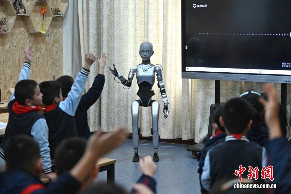 从4月全球首个人形机器人半程马拉松在北京亦庄鸣枪开跑,到8月国家速滑馆“冰丝带”迎来世界人形机器人运动会,再到10月首届中国(国际)机器人辩论大赛上演“人机思辨”——这一年,人形机器人从实验室迈入现实场景,以“量产元年”之势完成了从运动耐力到智能交互的全面跨越。从产线到展厅,从秀场到赛场,多场景、多任务的验证,正将一个人形机器人规模化应用的未来推到我们眼前。图为10月27日,全球首款全尺寸仿生教育机器人在安徽省合肥市亮相,并与专业老师协作讲授了一堂科学教育课。