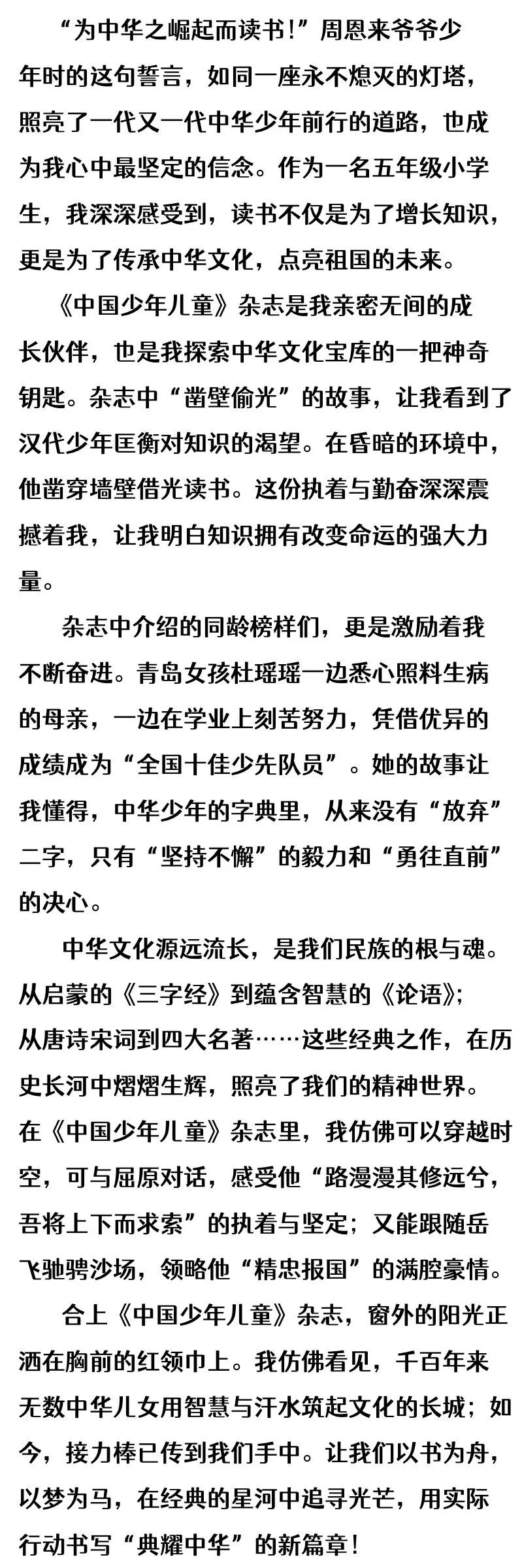 可以看出,小作者是《中国少年儿童》杂志的忠实读者,对杂志内容简直如数家珍。能够感受到,他把这本杂志当成了“朋友”,真的在与杂志故事中的人物交流思想,且收获颇多。而且,整篇文章能感受到小作者作为当代少年的自豪感和责任感。字里行间充满的激情,让我们看到了祖国未来的希望。如果每一个少年都有“为中华之崛起而读书”的梦想和担当,我们的祖国一定会越来越强大,未来也会更加美好。