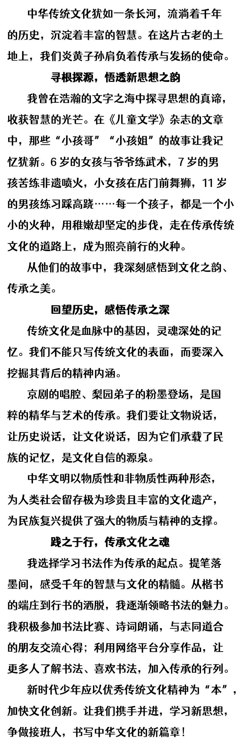 童瑞昕同学的《少年心逐文化浪,新思扬帆续古章》以真挚的情感和生动的实例,展现了新时代少年对中华优秀传统文化的热爱与尊崇。文章通过“小孩哥”“小孩姐”的故事、书法实践的描述,将文化传承具象化,体现了知行合一的精神。语言流畅,层次分明,既有对传统文化的深刻感悟,又有实际行动的体现,是一篇充满文化自信与责任感的佳作。