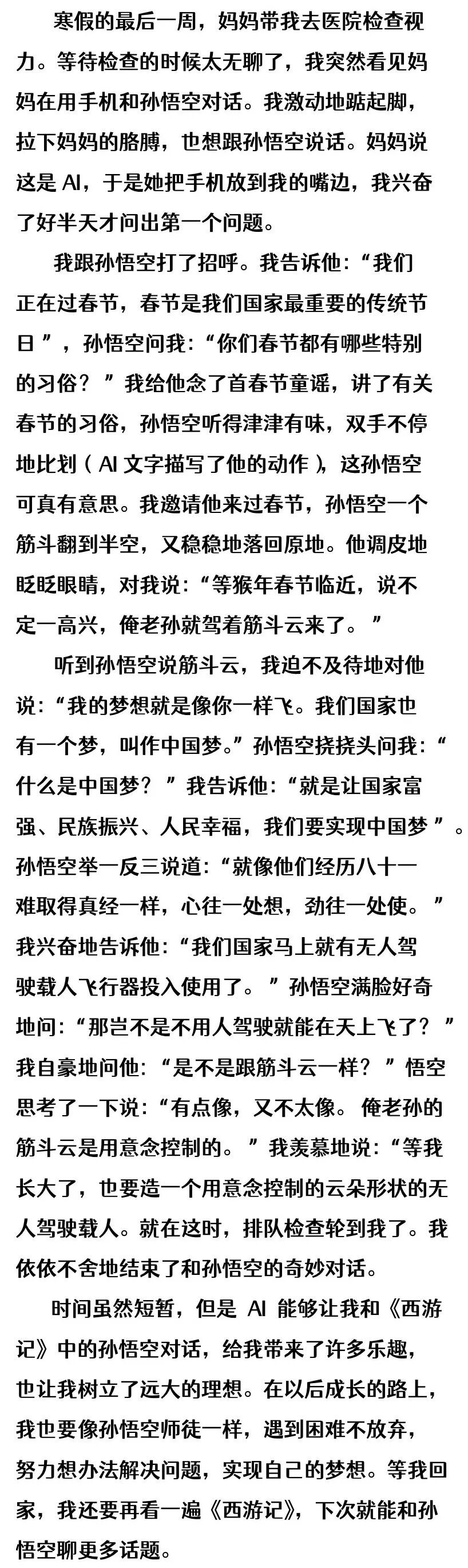 这篇小文章生动地描绘了一个孩子与AI互动时的天真幻想与求知热情。小作者通过写与“AI孙悟空”的对话,巧妙地展现了传统神话故事与现代科技的碰撞。全文语言活泼自然,对话设计富有童趣,结尾处将虚拟体验转化为现实激励的升华尤为精彩,既体现了AI的教育价值,也传递了积极向上的成长态度。