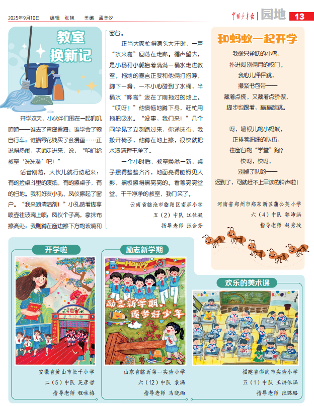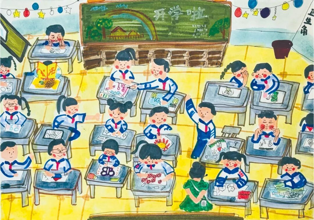 03教室换新记开学这天,小伙伴们围在一起叽叽喳喳——谁去了青岛看海;谁学会了骑自行车;谁攒零花钱买了套漫画……正说得热闹,老师走进来,说:“咱们给教室‘洗洗澡’吧!”