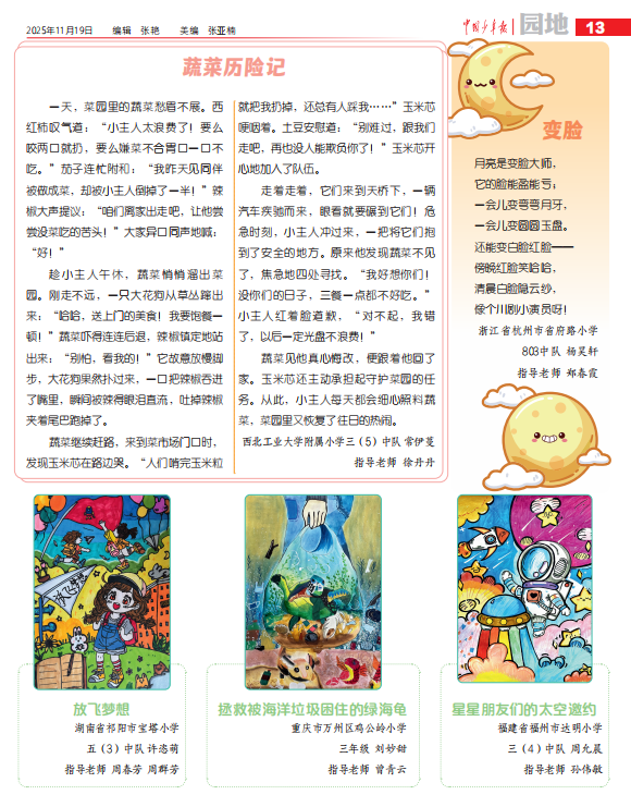 走着走着,它们来到天桥下,一辆汽车疾驰而来,眼看就要碾到它们!危急时刻,小主人冲过来,一把将它们抱到了安全的地方。原来他发现蔬菜不见了,焦急地四处寻找。“我好想你们!没你们的日子,三餐一点都不好吃。” 小主人红着脸道歉,“对不起,我错了,以后一定光盘不浪费!”
