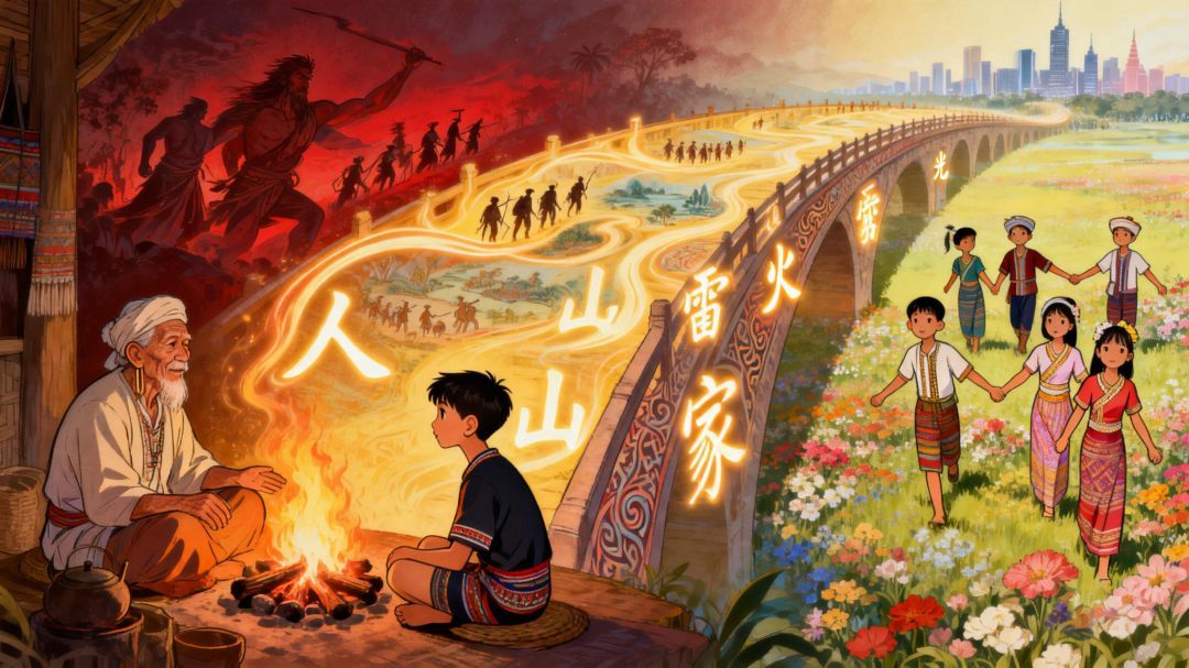 那一刻,我真正懂了。汉字,从来不是一个要我们忘记过去的“新家园”,而是一座最雄伟、最坚固的“桥”。桥的这头,连着阿爷的火塘、民族的记忆;桥的那头,通向辽阔的远方,让玉拉,让所有56个民族的兄弟姐妹,都能走过这座桥,看见彼此世界里最美的风景。