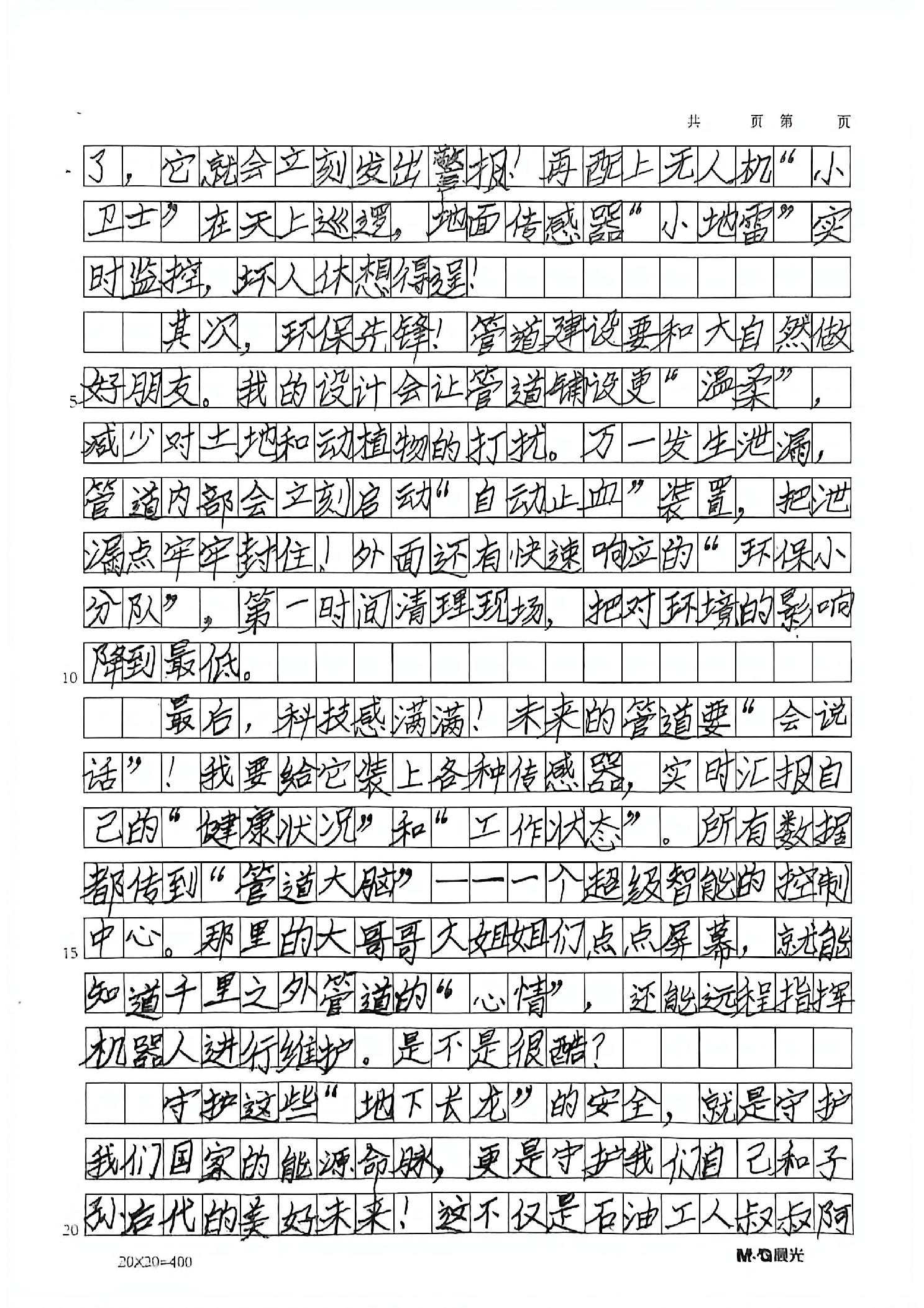 晚上我做了一个梦,梦见自己成了管道设计师,画出了一幅神奇的“能源丝路图”。我设计的管道,是会呼吸的智能巨龙!它们的身体用了一种叫“记忆合金”的特殊材料,地震来时像跳舞一样扭动,地震停了又变回原样。管道内壁涂着神奇涂料,滑得就像荷叶上的露珠,原油“嗖”地一下就滑过去了,根本不想停下来粘在管壁上。这些管道还是爱美的姑娘!它们在沙漠段披着太阳能板披风,在农田段戴着小草帽,经过森林时就伪装成树干。最厉害的是,一旦有地方“生病”,管道会自己吐出机器人医生,像白细胞一样赶去修补。诗人杜甫说的“润物细无声”,不就是它们默默奉献的样子吗?我的管道们还是好朋友,石油管道给水管讲波斯湾的故事,天然气管听煤气管唱草原牧歌。它们组成了一支乐队,用能源演奏着新版《琵琶行》:“大弦嘈嘈如急雨,小弦切切如私语。”